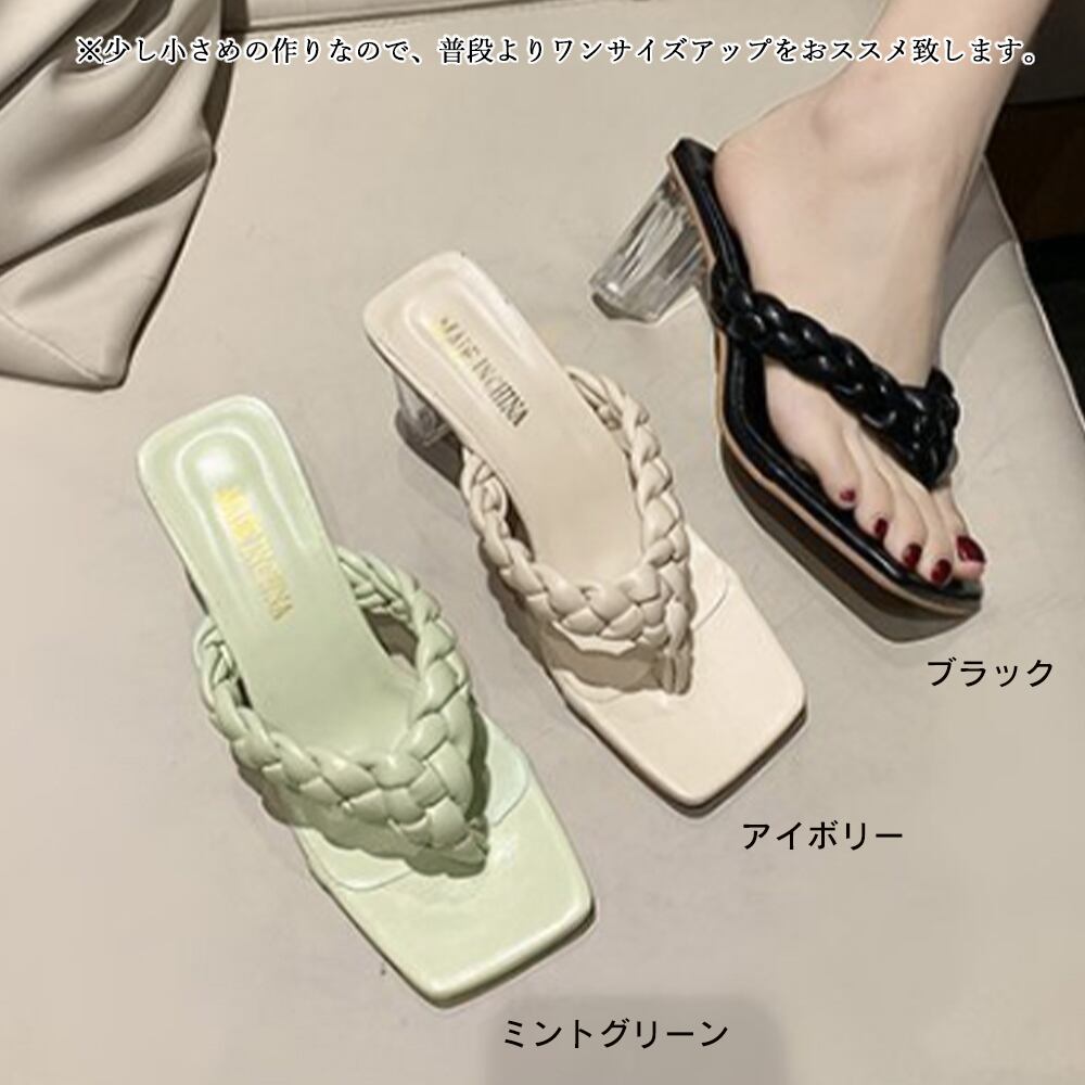 レディース 夏 スクエアトゥ ビーチサンダル おしゃれ 太ヒール スリッパ 履きやすい 靴 サマーサンダル美脚 ビーサン疲れにくい リゾートサンダル編み込みデザインがとてもお洒落なスクエアトゥクリアヒールサンダルちょうどいい高さのヒールで歩きやすく、さりげなく脚長効果も狙える足元に抜け感があって、最旬な印象に仕上げる甲素材:合成皮革底素材:合成底カラー:ブラック/アイボリー/ミントグリーンサイズ:22.5cm(35)/23.0cm(36)/23.5cm(37)/24.0cm(38)/24.5cm(39)(カッコ内は靴底表記となります)[22.5]長さ:約22.5cm 幅:約7.5cm ヒール:約6.5cm[23.0]長さ:約23.0cm 幅:約7.6cm ヒール:約6.5cm[23.5]長さ:約23.5cm 幅:約7.7cm ヒール:約6.5cm[24.0]長さ:約24.0cm 幅:約7.8cm ヒール:約6.5cm[24.5]長さ:約24.5cm 幅:約7.9cm ヒール:約6.5cm重さ(両足):約515g-554g生産国:中国※すべて平置きサイズです(採寸方法違いより、多少の誤差がございますので、ご了承ください)。※商品は縫製上の細かいほつれ、汚れ、接着剤が残り、素材特有の臭いや接着剤等の臭いが残っている場合がございます。ご了承ください。※海外輸入品のため、商品の細部仕様は多少異なる場合がございます。予めご了承の上、ご注文お願い致します。