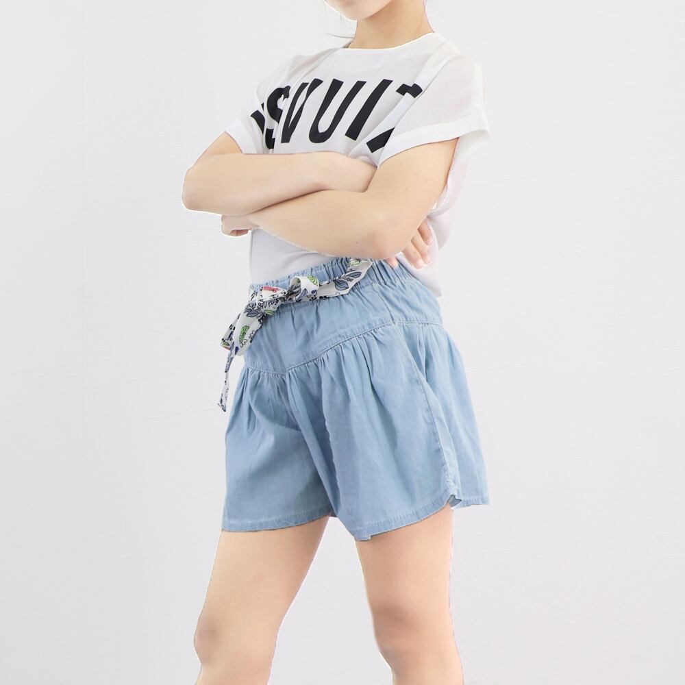 キッズ ジュニア 女の子 スカート風 デニム短パン 柄付きベルト 子ども服 可愛い 薄手 薄い 春 秋 通学着子供ジーパン 姉妹お揃いボトムススカートに見えるガーリースタイルのキュロットデニムショートパンツ。シンプルな定番デザインで、ウエストはゴムになっているのでお着替え簡単。取り外し可能の柄付きベルトはボタンでウエストの両サイドに付けるタイプ、前後に結ぶことができる。お出かけにも学校にも色々なコーデに大活躍間違いなし。素材:綿65%+ポリエステル35%カラー:ライトブルーサイズ:120/130/140/150/160※詳細は下記の「サイズ」を必ずご参考にしてご購入ください。※普段よりツーサイズアップをおススメ致します。[120]着丈:約29cm 股下:約6cm ウエスト:約46-56cm ヒップ:約82cm もも周り:約60cm[130]着丈:約30cm 股下:約7cm ウエスト:約48-58cm ヒップ:約86cm もも周り:約62cm[140]着丈:約31cm 股下:約8cm ウエスト:約50-60cm ヒップ:約90cm もも周り:約64cm[150]着丈:約32cm 股下:約9cm ウエスト:約52-62cm ヒップ:約94cm もも周り:約66cm[160]着丈:約33cm 股下:約9cm ウエスト:約54-64cm ヒップ:約98cm もも周り:約68cm裏地:なし伸縮性:なし透け感:なし生産国:中国※すべて平置きサイズです(採寸方法違いより、多少の誤差がございますので、ご了承ください)。※海外輸入品のため、商品の細部仕様は多少異なる場合がございます。予めご了承の上、ご注文お願い致します。