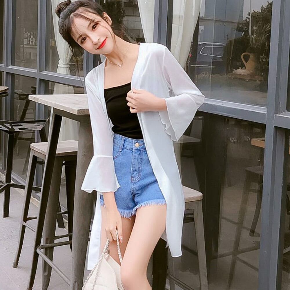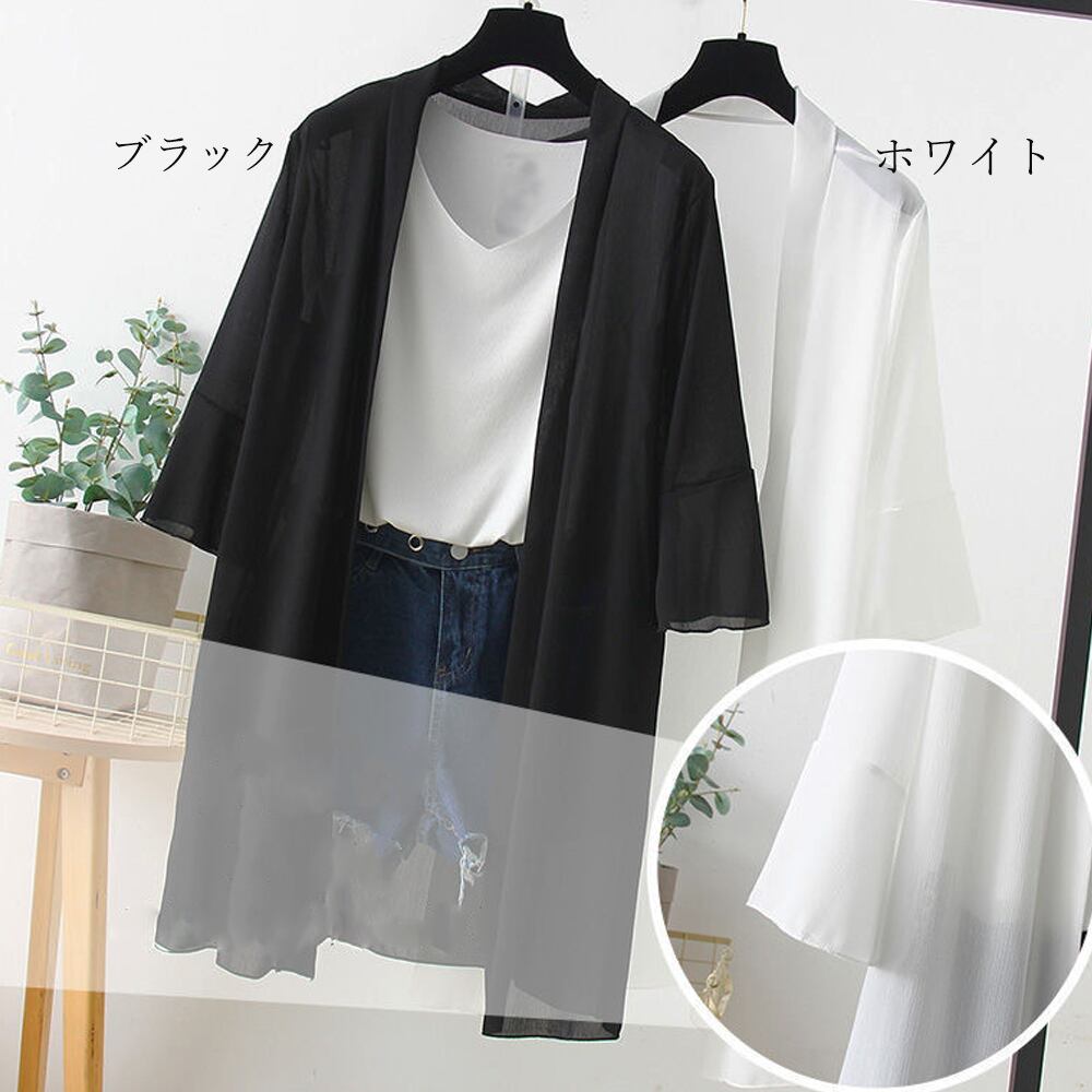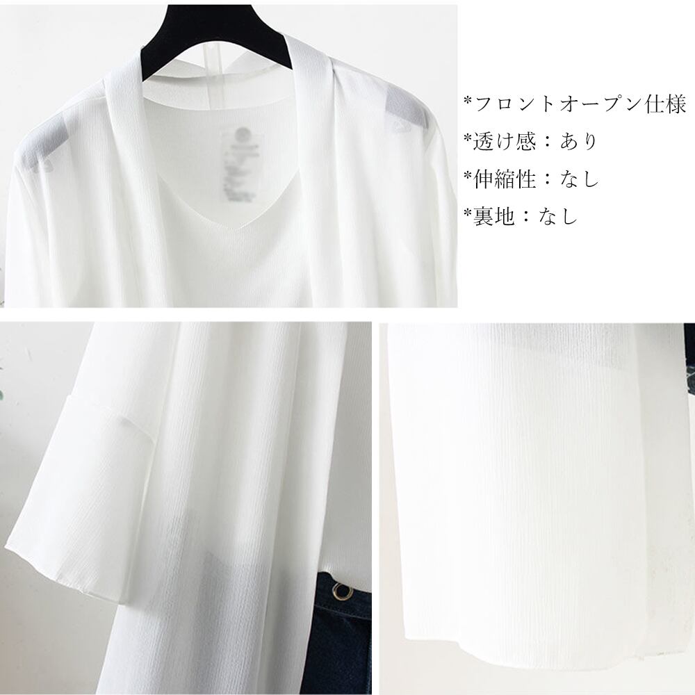Vネックブラウス シフォン 紫外線対策 リゾートカーディ 透け感 ゆったり ロング丈トップス 体型カバー 夏服 日焼け防止 羽織透け感素材なので夏に涼しく着られる紫外線対策を忘れてしまった時でも、サッと羽織るだけでオシャレに紫外線をケアしてくれる優れもの冷房対策もできるので、いつもバッグの中に携帯しておきたいアイテム素材:ポリエステル100%カラー:ホワイト/ブラックサイズ:ワンサイズ着丈:約86cm 肩幅:約46cm 袖丈:約38cm ゆき:約61cm 身幅(フロントオープン仕様):約52cm裏地:なし伸縮性:なし透け感:あり生産国:中国※すべて平置きサイズです(採寸方法違いより、多少の誤差がございますので、ご了承ください)。※海外輸入品のため、商品の細部仕様は多少異なる場合がございます。予めご了承の上、ご注文お願い致します。