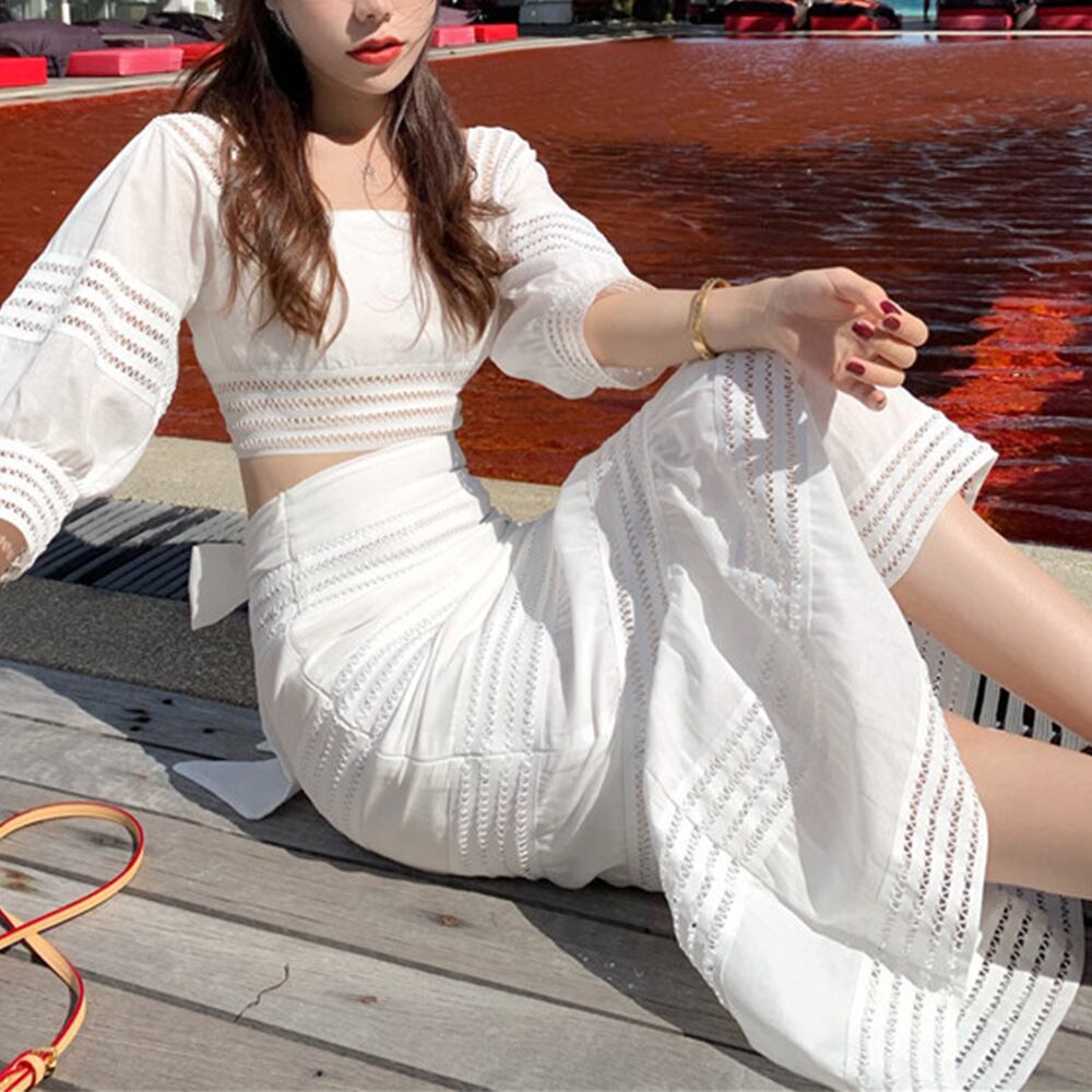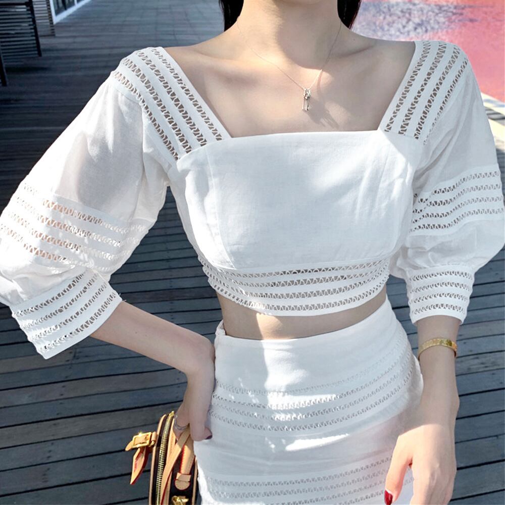ショート丈 トップス ハイウエスト ロングスカート 上下セット スクエアネック ブラウス リゾートドレス リゾート 春夏 背中あき へそ出し バックリボン高みえ大人女性の清楚感を出してくれるショート丈トップスとハイウエストロングスカートの2点セットハイウエストスカートは脚長効果が期待できちゃう気になる男性や付き合いたての彼とのデートの服装に是非チョイスしてみてはトップス素材:ポリエステル95%+綿5%スカート素材:ポリエステル95%+綿5%カラー:ホワイトサイズ:S/M/Lトップス:[S]着丈:約31cm 肩幅:約37cm 袖丈:約32cm ゆき:約50.5cm 身幅:約36cm 胸囲:約72cm[M]着丈:約32cm 肩幅:約38cm 袖丈:約33cm ゆき:約52cm 身幅:約39cm 胸囲:約78cm[L]着丈:約33cm 肩幅:約39cm 袖丈:約34cm ゆき:約53.5cm 身幅:約42cm 胸囲:約84cmスカート:[S]スカート丈:約81cm ウエスト:約64cm ヒップ:約76cm[M]スカート丈:約83cm ウエスト:約68cm ヒップ:約80cm[L]スカート丈:約85cm ウエスト:約72cm ヒップ:約84cm裏地:スカートのみあり伸縮性:なし透け感:ややあり生産国:中国※すべて平置きサイズです(採寸方法違いより、多少の誤差がございますので、ご了承ください)。※海外輸入品のため、商品の細部仕様は多少異なる場合がございます。予めご了承の上、ご注文お願い致します。