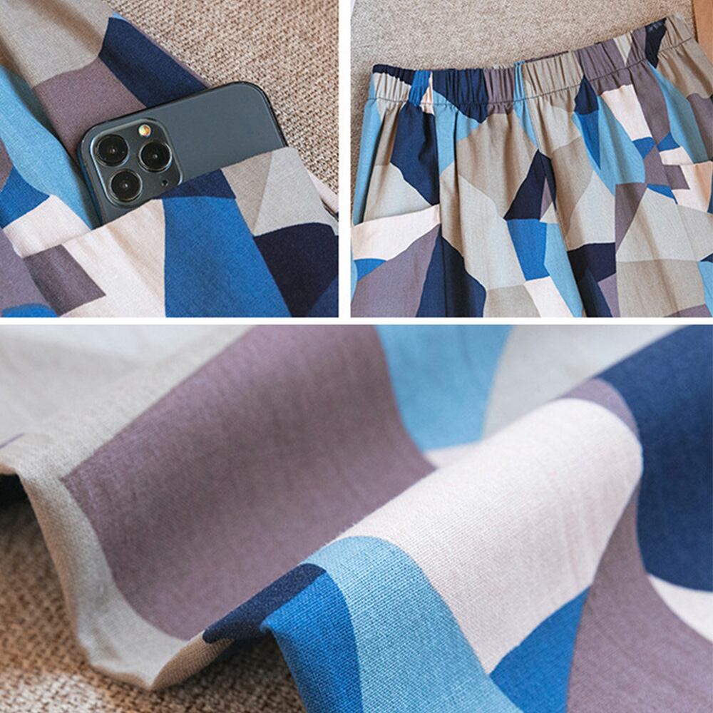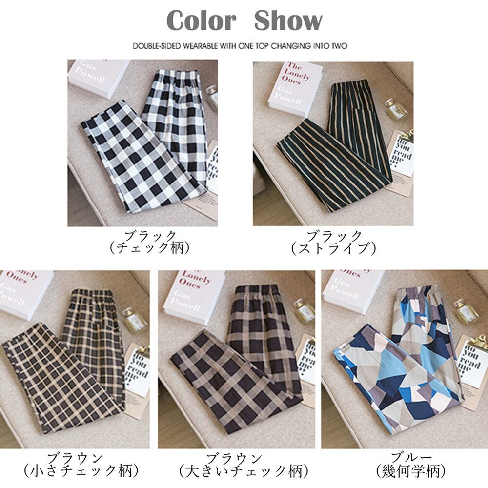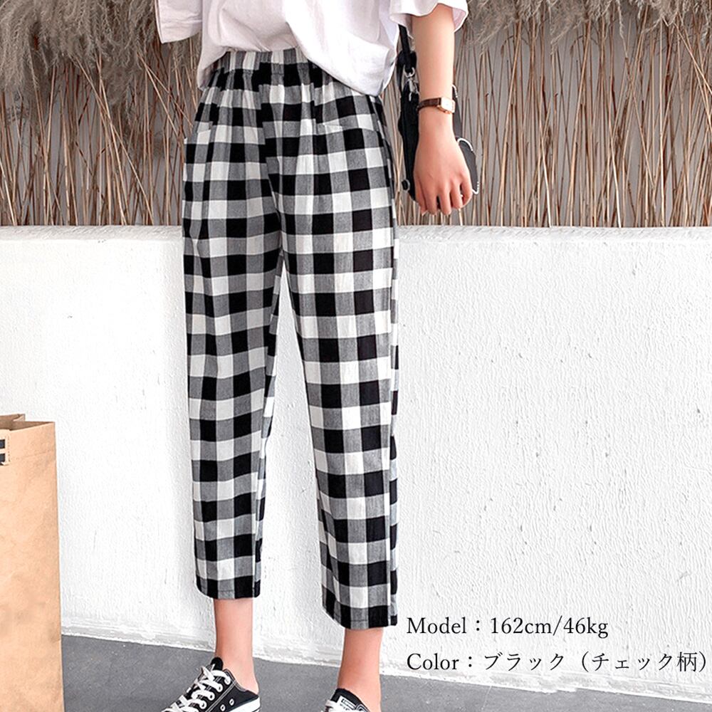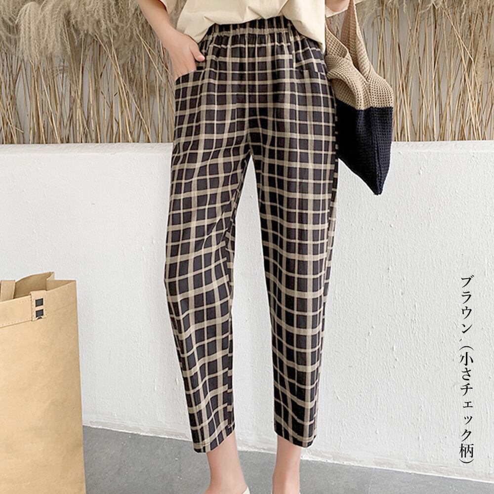 ゆったり クロップドパンツ ウエストゴム おしゃれ カジュアルパンツ 大人かわいい ロングパンツ 薄手 春夏 秋チェック柄 パンツ 九分丈 くるぶし丈 ストライプボトムススタイルアップがかなえるウエストゴム仕様アンクルパンツ足首が見えることで華奢な女性らしさを強調することが出来るシンプルなブラウスを合わせると、清楚な雰囲気をプラス素材:綿90%+ポリエステル10%カラー:ブラック(チェック柄)/ブラック(ストライプ)/ブラウン(小さチェック柄)/ブラウン(大きいチェック柄)/ブルー(幾何学柄)サイズ:ワンサイズ(XL)着丈:約84cm 股下:約55cm ウエスト:約60-92cm(ゴム仕様) ヒップ:約100cm もも周り:約58cm裏地:なし伸縮性:なし透け感:なし生産国:中国※すべて平置きサイズです(採寸方法違いより、多少の誤差がございますので、ご了承ください)。※海外輸入品のため、商品の細部仕様は多少異なる場合がございます。予めご了承の上、ご注文お願い致します。