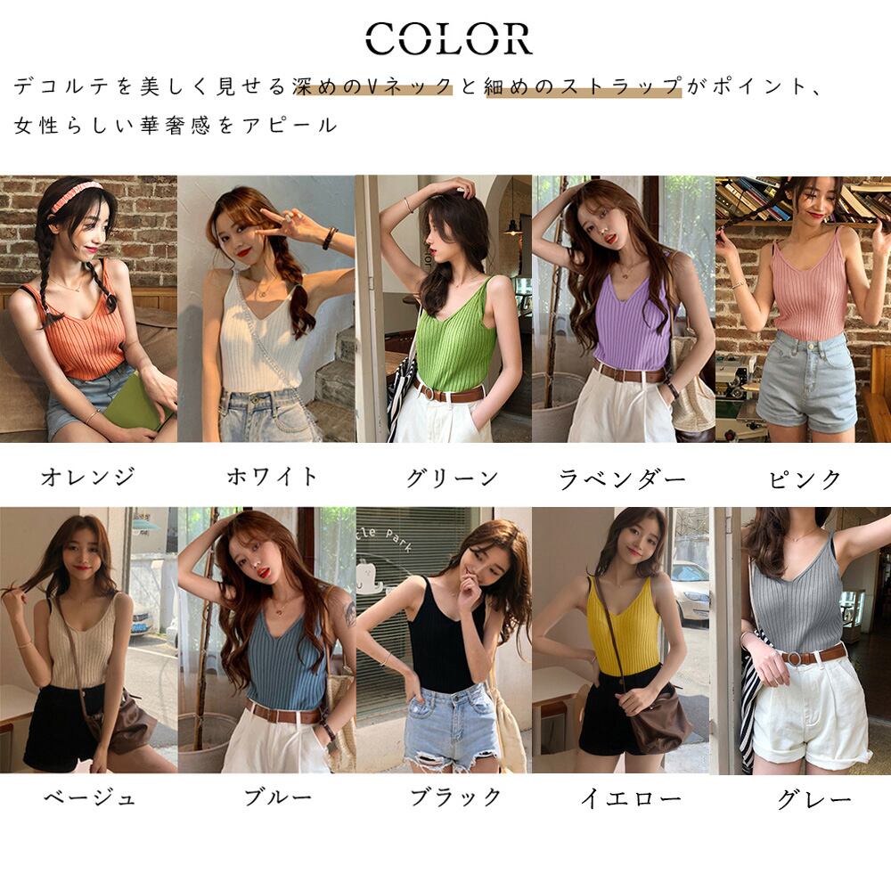 ノースリーブ サマーニット レディース ローゲージ ビスチェ セクシー ニットトップス シンプル 無地 レイヤードセクシーキャミ韓国 太リブストレッチ 重ね着 インナー肌触りの良いリブニット生地で仕上げたフェミニンな印象のサマーニットキャミデコルテを美しく見せる深めのVネックと細めのストラップがポイント、女性らしい華奢感をアピールボディに沿うシルエット、単品でそのまま着るのはもちろん、レイヤードにも使える万能アイテム素材:ポリエステル85%+レーヨン10%+ポリウレタン5%カラー:ブラック/ホワイト/グレー/ベージュ/ブルー/ラベンダー/ピンク/イエロー/オレンジ/グリーンサイズ:ワンサイズ着丈:約52cm 身幅:約31cm 胸囲:約62-115cm裏地:なし伸縮性:あり透け感:ホワイトのみややあり生産国:中国※すべて平置きサイズです(採寸方法違いより、多少の誤差がございますので、ご了承ください)。※海外輸入品のため、商品の細部仕様は多少異なる場合がございます。予めご了承の上、ご注文お願い致します。
