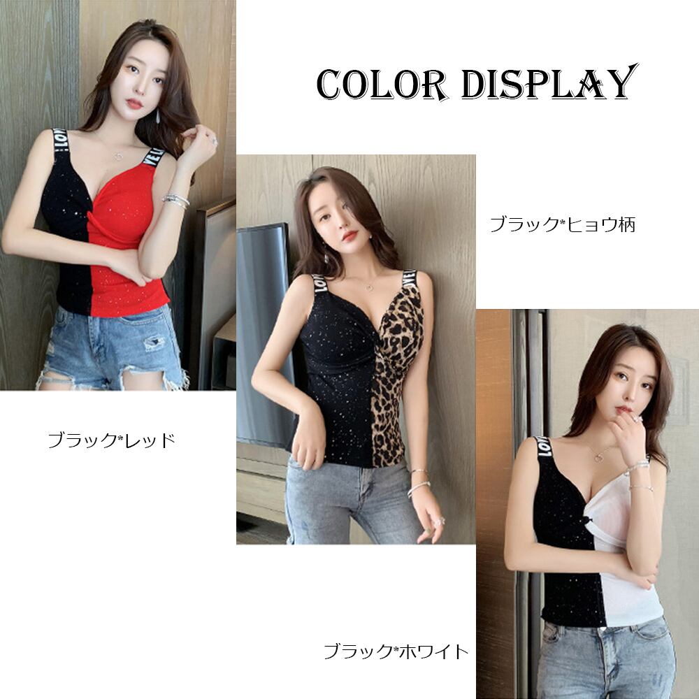 レディース ノースリーブ Vネック ラメシャイニー タンクトップ ダンス衣装 インナー夏サマーきれいめ ブラ紐隠しインナー セクシー おしゃれ1枚でもインナーでも大活躍の配色トップス。左右の配色デザインが、印象的で目を惹く嬉しいポイント。ショルダーストラップのロゴはカジュアルなスタイルだけでなく、キレイめコーデのアクセントにも。パンツやスカートなど組み合わせ次第で、カジュアルにもきれいめにも着れるアイテム♪素材:ポリエステル85%+ポリウレタン15%カラー:ブラック*ヒョウ柄/ブラック*ホワイト/ブラック*レッドサイズ:M/L/XL[M]着丈:約52cm 肩幅:約29cm 身幅:約37cm 胸囲:約74-104cm[L]着丈:約53cm 肩幅:約30cm 身幅:約38cm 胸囲:約76-106cm[XL]着丈:約54cm 肩幅:約31cm 身幅:約39cm 胸囲:約78-108cm裏地:あり伸縮性:あり透け感:ブラック*ホワイトのみあり生産国:中国※すべて平置きサイズです(採寸方法違いより、多少の誤差がございますので、ご了承ください)。※海外輸入品のため、商品の細部仕様は多少異なる場合がございます。予めご了承の上、ご注文お願い致します。