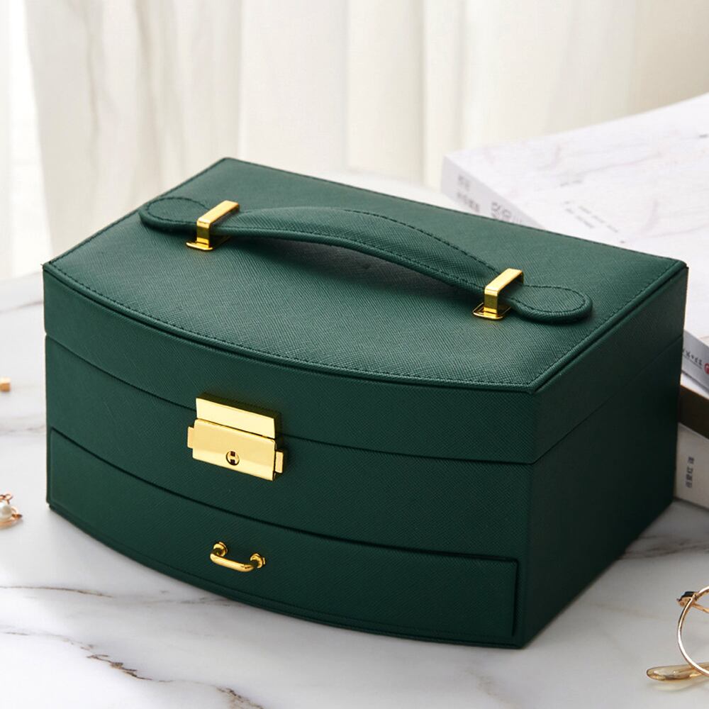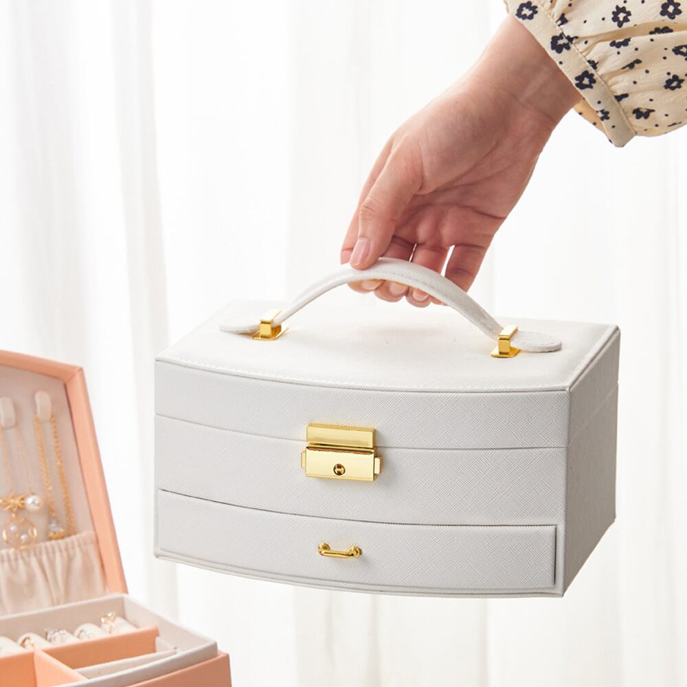 ジュエリーボックス 二段式 鏡付き 鍵付き 引出し収納ボックス ジュエリー収納 宝石箱 小物入れ アクセサリー収納多層収納 携帯用 アクセサリー 収納 ギフト 贈り物たくさんのアクセサリーや小物を収納できるおしゃれなジュエリーボックスコンパクトミラー付きでとても便利大容量収納の二段式仕様、外側が高級感のあるPUレザー製、内側が柔らかな起毛素材で大切なジュエリーをキズからしっかり守る。自宅保管用だけでなく、プレゼントにもオススメ外側素材:合成皮革内側素材:ポリエステルカラー:ホワイト/サーモンピンク/ダークグリーンサイズ:幅:約20cm 奥行:約15cm 高さ:約10cm重さ:約684g裏地:なし内ポケット:あり生産国:中国※すべて平置きサイズです(採寸方法違いより、多少の誤差がございますので、ご了承ください)。※海外輸入品のため、商品の細部仕様は多少異なる場合がございます。予めご了承の上、ご注文お願い致します。