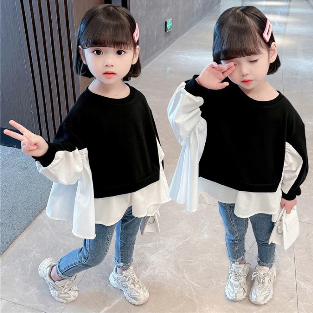 キッズ おしゃれ ドルマンスリーブ 子供服 秋 姉妹 お揃い カジュアル 女の子 異素材 重ね着風可愛い 双子 通園 小学生普段着通学着 春 冬 切り替えレイヤードデザインがオシャレな子供用ドッキングトップスです。ふんわりと広がるシルエットが可愛いポイントです。お手持ちのショートパンツやスキニーパンツと合わせるとコーデの幅が広がります。素材:綿65%+ポリエステル35%カラー:ブラック*ホワイトサイズ:120/130/140※詳細は下記の「サイズ」を必ずご参考にしてご購入ください。※普段よりワンサイズアップをおススメ致します。[120]着丈:約47cm 肩幅:約35cm 袖丈:約35cm ゆき:約52.5cm 身幅:約50cm 胸囲:約100cm[130]着丈:約50cm 肩幅:約38cm 袖丈:約38cm ゆき:約57cm 身幅:約53cm 胸囲:約106cm[140]着丈:約53cm 肩幅:約41cm 袖丈:約41cm ゆき:約61.5cm 身幅:約56cm 胸囲:約112cm裏地:なし伸縮性:身頃部分のみややあり透け感:ホワイト部分のみややあり生産国:中国※すべて平置きサイズです(採寸方法違いより、多少の誤差がございますので、ご了承ください)。※海外輸入品のため、商品の細部仕様は多少異なる場合がございます。予めご了承の上、ご注文お願い致します。