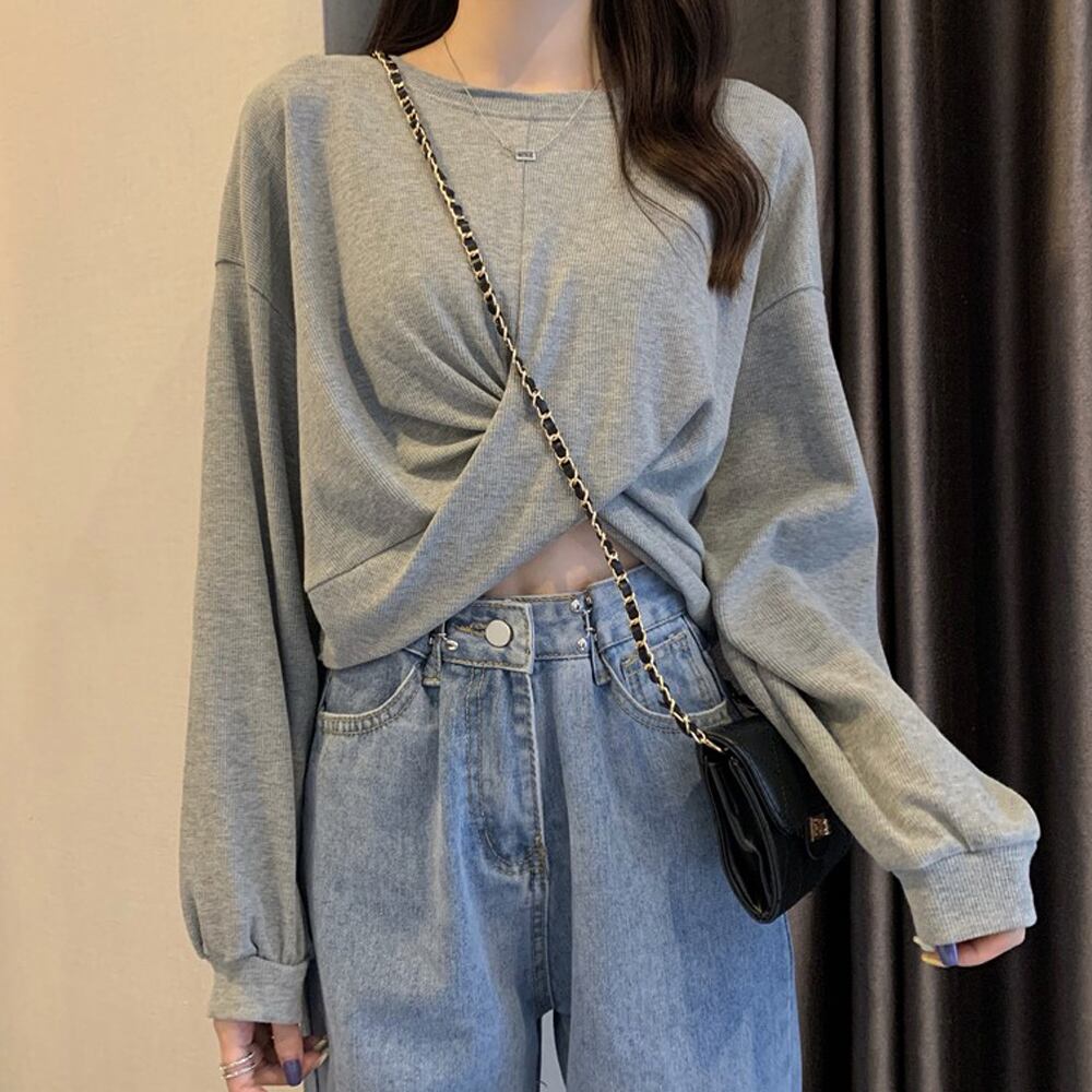 レディース 長袖 カジュアル フロントクロス ショートTシャツ 春秋冬 無地 セクシー ヒップホップ おしゃれスウェット 通勤 大人可愛い 韓国風 女性 スプリングフロントクロスデザインのショート丈tシャツ。へそ出し仕様はスタイルをスッキリと魅せてくれる。ショート丈なので、ハイウエストパンツと合わせた大人カジュアルなスタイルにも。素材:ポリエステル100%カラー:ブラック/ホワイト/グレーサイズ:XL/2XL[XL]着丈:前丈約36cm/後ろ丈約44cm 肩幅:約54cm 袖丈:約47cm ゆき:約74cm 身幅:約55cm 胸囲:約110cm[2XL]着丈:前丈約38cm/後ろ丈約46cm 肩幅:約58cm 袖丈:約48cm ゆき:約77cm 身幅:約58cm 胸囲:約116cm裏地:なし伸縮性:なし透け感:ホワイトのみややあり生産国:中国※すべて平置きサイズです(採寸方法違いより、多少の誤差がございますので、ご了承ください)。※海外輸入品のため、商品の細部仕様は多少異なる場合がございます。予めご了承の上、ご注文お願い致します。