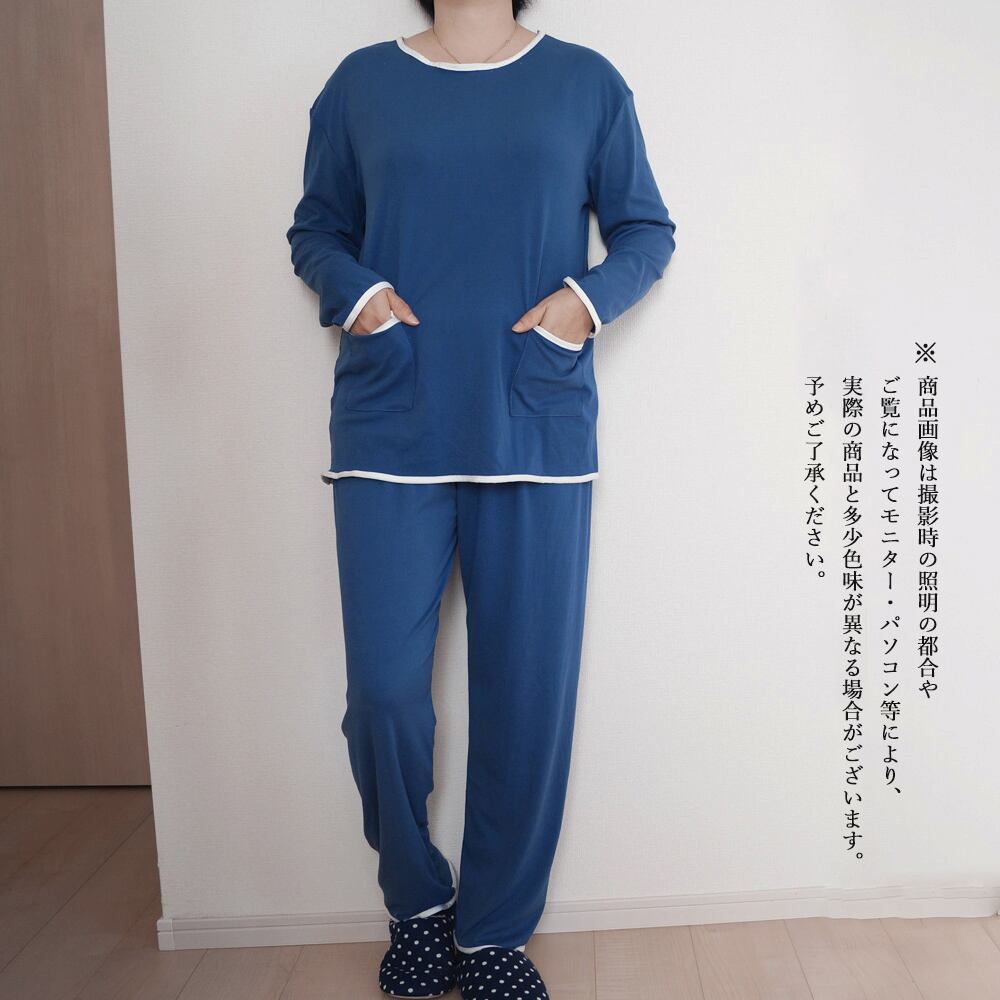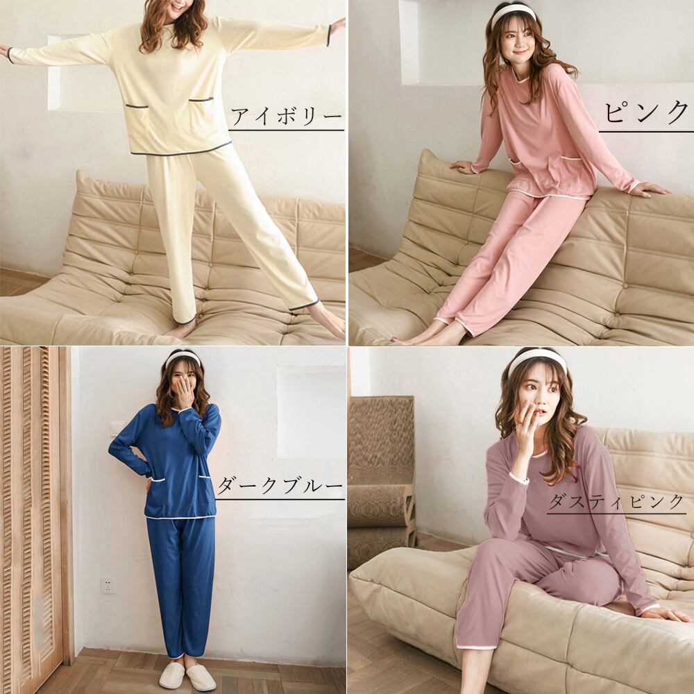 上下セット ポケット付き クルーネックトップス 部屋着 韓国風 2点セット ゆったりナイトウェア 長袖 ウエストゴム ロングズボンさらっとした柔らかい素材で快適な着心地トップスの左右にポケットがついているので、とても便利セット使いはもちろん、別々でも使えるのも嬉しいポイント素材:綿65%+ポリエステル35%カラー:アイボリー/ダスティピンク/ピンク/ダークブルーサイズ:ワンサイズトップス:着丈:約64cm 肩幅:約50cm 袖丈:約52cm ゆき:約77cm 身幅:約53cm 胸囲:約106-130cmボトムス:着丈:約92cm 股下:約62cm ウエスト:約64-100cm(ゴム仕様) ヒップ:約108cm もも周り:約62cm裏地:なし伸縮性:あり透け感:なし生産国:中国※すべて平置きサイズです(採寸方法違いより、多少の誤差がございますので、ご了承ください)。※海外輸入品のため、商品の細部仕様は多少異なる場合がございます。予めご了承の上、ご注文お願い致します。