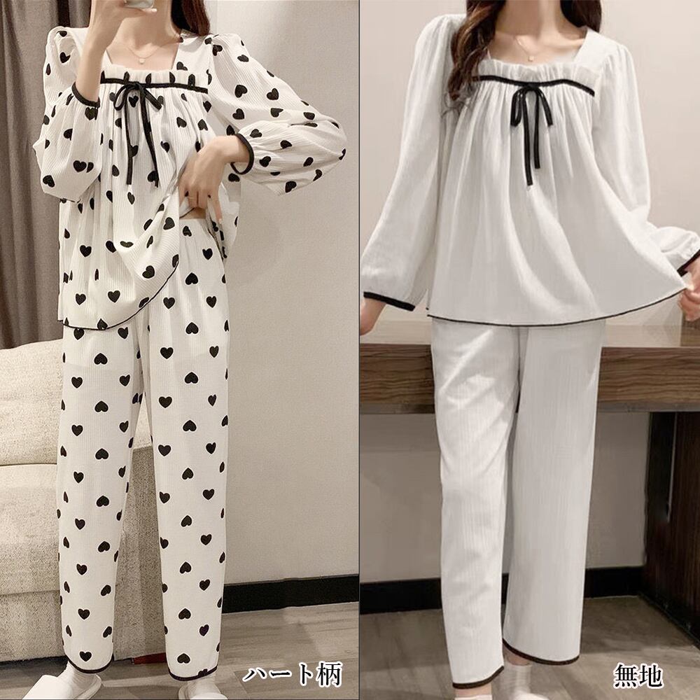 部屋着 セットアップ 長袖 セパレート パジャマ 大人可愛い 寝巻き 2点 セット ナイトウェア 春夏秋冬 部屋着入院 パジャマ長袖 ガーリー 部屋着 ルームウェア 無地お家のリラックスタイムでも可愛くいたい女性のワガママを実現するリボン付きタック入りフリル襟の部屋着2点セット太めリブで縦線見え、ぽわんとした袖ラインで二の腕をカバー、上質の綿混素材で快適な着心地をもたらす女子感たっぷりなルームウェアなので自宅でも女子同士のお泊り会でも恋人とのスイートタイムでもおススメ素材:ポリエステル70%+綿30%カラー:ハート柄/無地サイズ:ワンサイズ(XL)トップス:着丈:約57cm 肩幅:約38cm 袖丈:約56cm ゆき:約75cm 身幅:約52cm 胸囲:約104cmボトムス:着丈:約90cm 股下:約61cm ウエスト(ゴム仕様):約54-110cm ヒップ:約100cm もも周り:約58cm裏地:なし伸縮性:なし透け感:ややあり生産国:中国※すべて平置きサイズです(採寸方法違いより、多少の誤差がございますので、ご了承ください)。※海外輸入品のため、商品の細部仕様は多少異なる場合がございます。予めご了承の上、ご注文お願い致します。