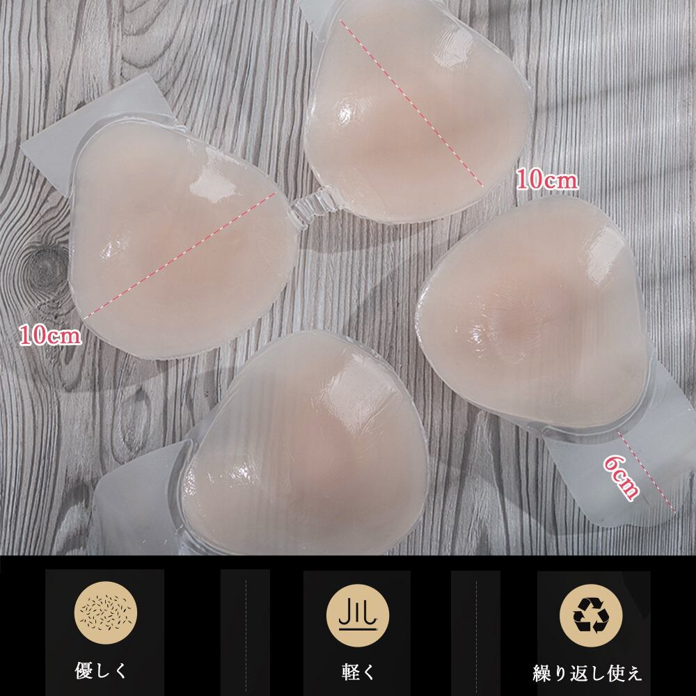 ノンワイヤー シリコンパッド 谷間 セクシー胸元 盛りブラ バストアップ ヌード ブラジャー 美胸 水着用ブラワイヤレス水着ブラ ドレスブラ 結婚式 ビキニ胸パッド軽量綺麗な谷間を作ってくれるノン ワイヤーシリコンブラ水洗いOKで繰り返し使え、デイリーからイベントまで幅広いシーンで活躍してくれる水着の下にはもちろん、ストラップレスだから背中あきトップスや結婚式の二次会ドレスにもおすすめ素材:シリコン100%カラー:ピンクベージュサイズ:ワンサイズ縦約10cm×横約10cm厚さ:約2cm内容量:左右1個ずつ生産国:中国※包装に関しての注意点:こちらの商品は激安で販売しているため、化粧箱は付いていませんが、商品に傷付かないよう簡易包装で発送とさせていただきます。※海外輸入品のため、商品の細部仕様は多少異なる場合がございます。予めご了承の上、ご注文お願い致します。
