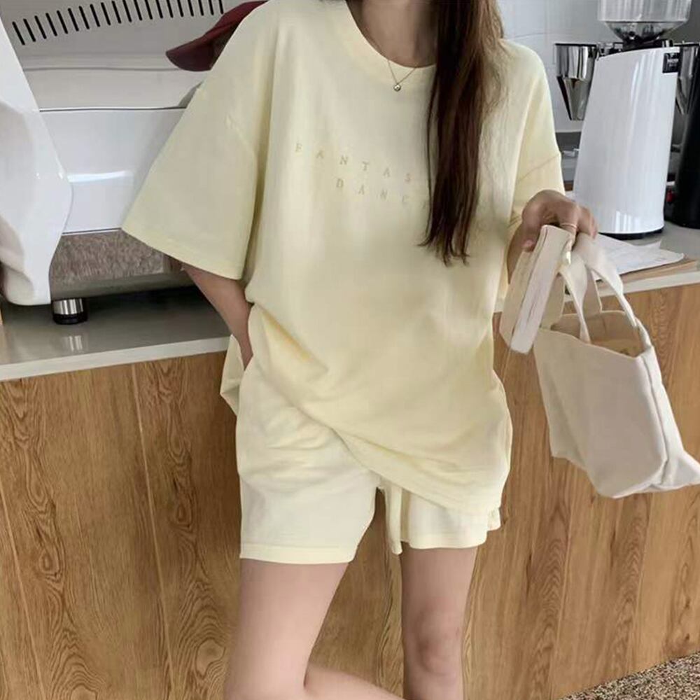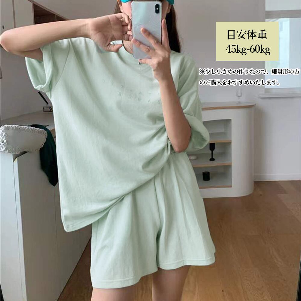 可愛い レディース ロゴカットソー 短パン 2点セット おしゃれ ルームウエア 上下セット 部屋着 大人カジュアルリラックスウエア夏 スウェット セット 韓国ファッションベーシックな半袖ロゴTシャツとショートパンツの上下セット別々での着用やルームウェアとしての着用など万能なアイテムおうちタイムを満喫できる、更にレジャーやスポーツシーンでも活躍いただける一着トップス素材:ポリエステル70%+綿30%ボトムス素材:ポリエステル70%+綿30%カラー:グレー/ホワイト/ブルー/薄イエロー/ミントグリーンサイズ:ワンサイズ(XL)トップス:着丈:約58cm 肩幅:約48cm 袖丈:約18cm ゆき:約42cm 身幅:約50cm 胸囲:約100cmボトムス:着丈:約40cm 股下:約10cm ウエスト(ゴム仕様):約54-106cm ヒップ:約100cm もも周り:約60cm裏地:なし伸縮性:ややあり透け感:淡色のみややあり生産国:中国※すべて平置きサイズです(採寸方法違いより、多少の誤差がございますので、ご了承ください)。※海外輸入品のため、商品の細部仕様は多少異なる場合がございます。予めご了承の上、ご注文お願い致します。