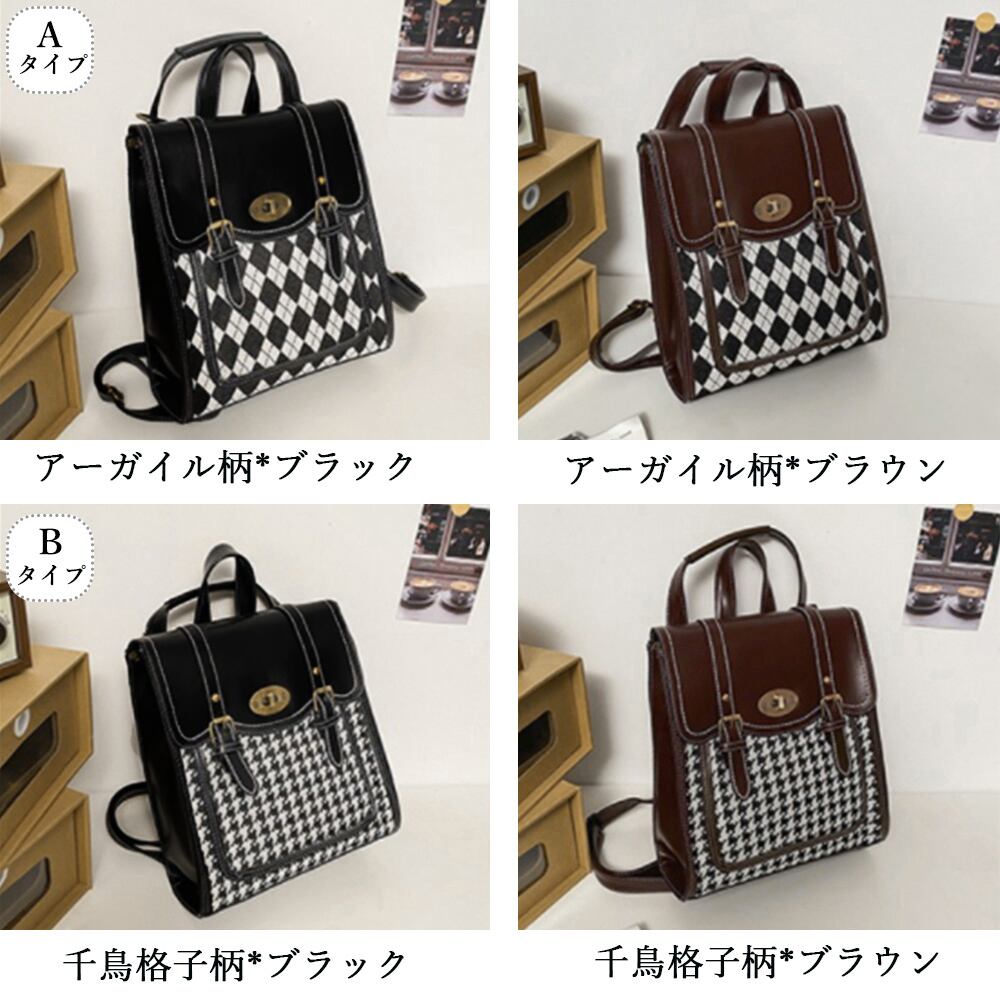 レトロ スクエアバックパック 千鳥格子柄 アーガイル柄 肩掛け PUレザー かばん チェック柄 大容量 鞄 通勤通学配色リュックサック 人気スクールバッグ カジュアル 韓国風コーデのポイントになる千鳥格子柄&アーガイル柄2タイプのリュックサックショルダーの上部を引っ張ればショルダーバッグとして、サイドを引っ張ればリュックとして簡単に形を変えて持つことができるA4サイズも収納可能な大容量サイズデイリーユースはもちろん、レジャーでも大活躍素材:合成皮革+ポリエステルタイプ:A(アーガイル柄)/B(千鳥格子柄)カラー:ブラック/ブラウンサイズ:ワンサイズ高さ:約31cm 底横幅:約27cm マチ:約9cm 持ち手:約21cm(調節不可、取り外し不可)ショルダー(ショルダーバッグ時):約84cm(調節不可、取り外し不可)ショルダー(リュック時):約46cm-89cm(調節可、取り外し不可)重さ:約834g裏地:なし内ポケット:あり生産国:中国※すべて平置きサイズです(採寸方法違いより、多少の誤差がございますので、ご了承ください)。※海外輸入品のため、商品の細部仕様は多少異なる場合がございます。予めご了承の上、ご注文お願い致します。