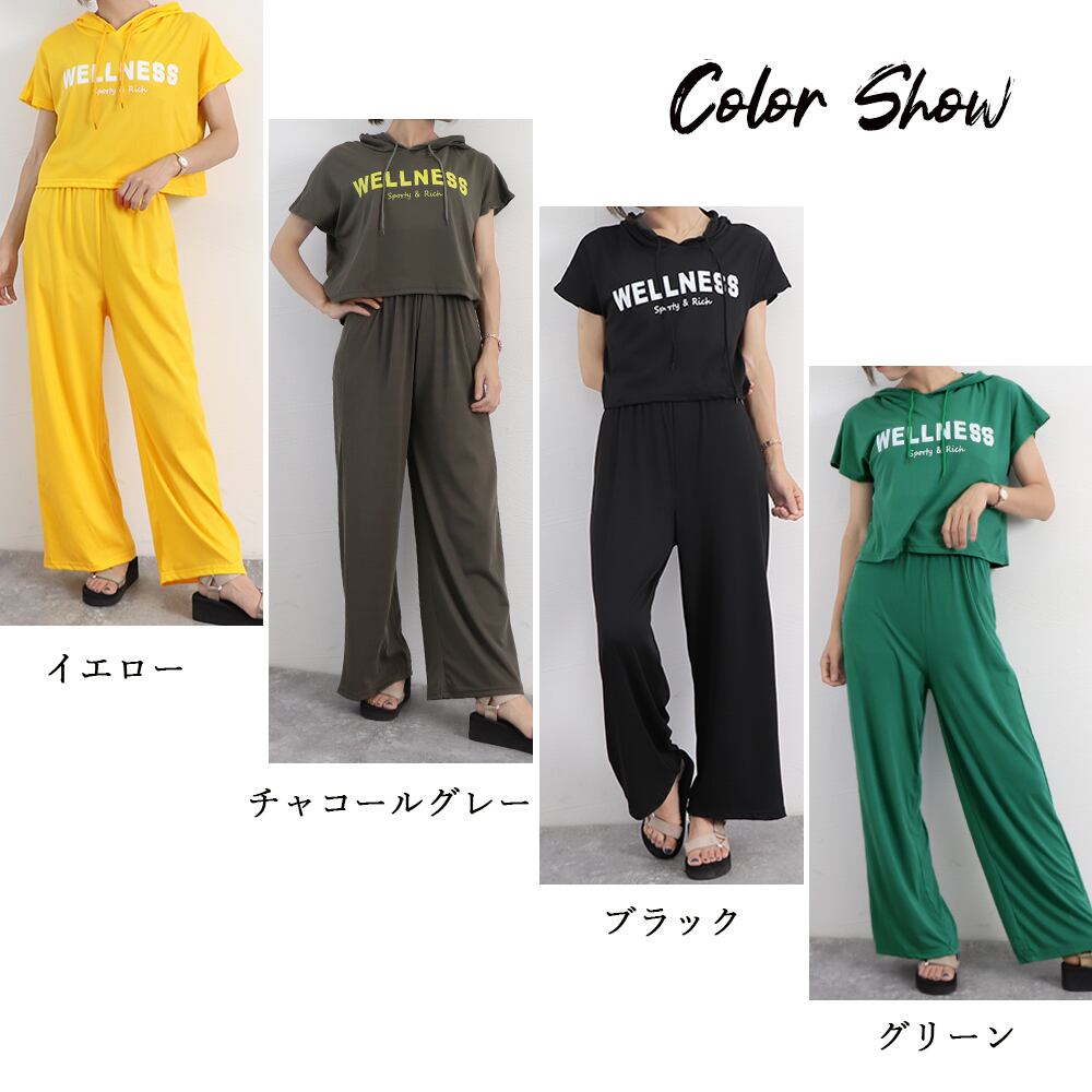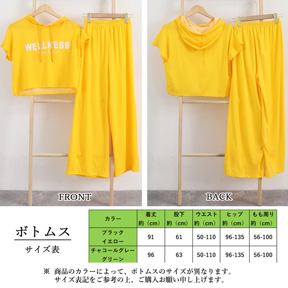 カジュアル ロゴ トレーナー 2点セット ショート丈トップス ワイドパンツ 上下セットハイウエスト薄手夏服 ルームウェアセットアップ部屋着 スポーツウェア運動 パーカーセット韓国トレンドと快適さを両立おしゃれな半袖スウェットセットアップトップスはクロップド丈でスタイルアップも狙える部屋着としてもよく、軽い外出時にセットで着るのに最適トップス素材:ポリエステル85%+綿15%ボトムス素材:ポリエステル85%+綿15%カラー:ブラック/チャコールグレー/グリーン/イエローサイズ:ワンサイズトップス:着丈:約43.5cm ゆき:約32cm 身幅:約49cm 胸囲:約98-140cmボトムス:商品のカラーによって、ボトムスのサイズが異なります。サイズ表記をご参考の上、ご購入お願い申し上げます。ブラック/イエロー着丈:約91cm 股下:約61cm ウエスト(ゴム仕様):約50-110cm ヒップ:約96-135cm もも周り:約56-100cmチャコールグレー/グリーン着丈:約96cm 股下:約63cm ウエスト(ゴム仕様):約50-110cm ヒップ:約96-135cm もも周り:約56-100cm裏地:なし伸縮性:あり透け感:イエローのみややあり生産国:中国※すべて平置きサイズです(採寸方法違いより、多少の誤差がございますので、ご了承ください)。※海外輸入品のため、商品の細部仕様は多少異なる場合がございます。予めご了承の上、ご注文お願い致します。