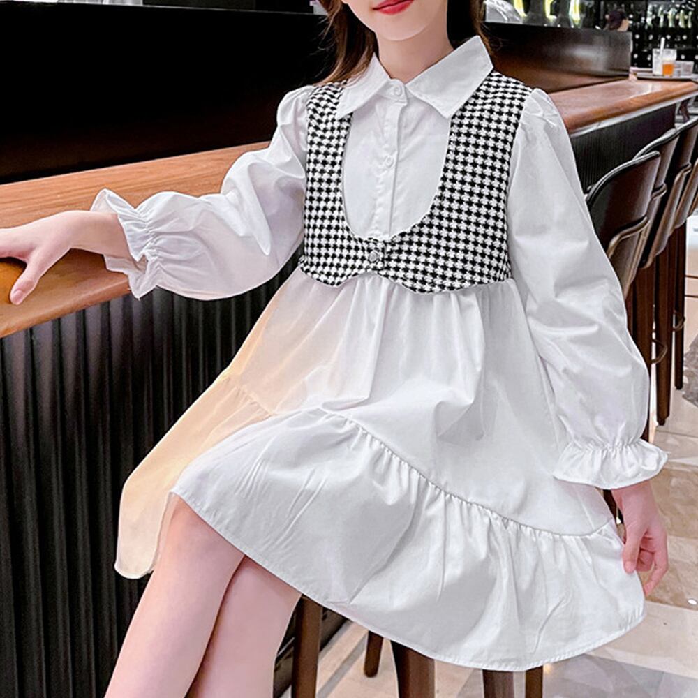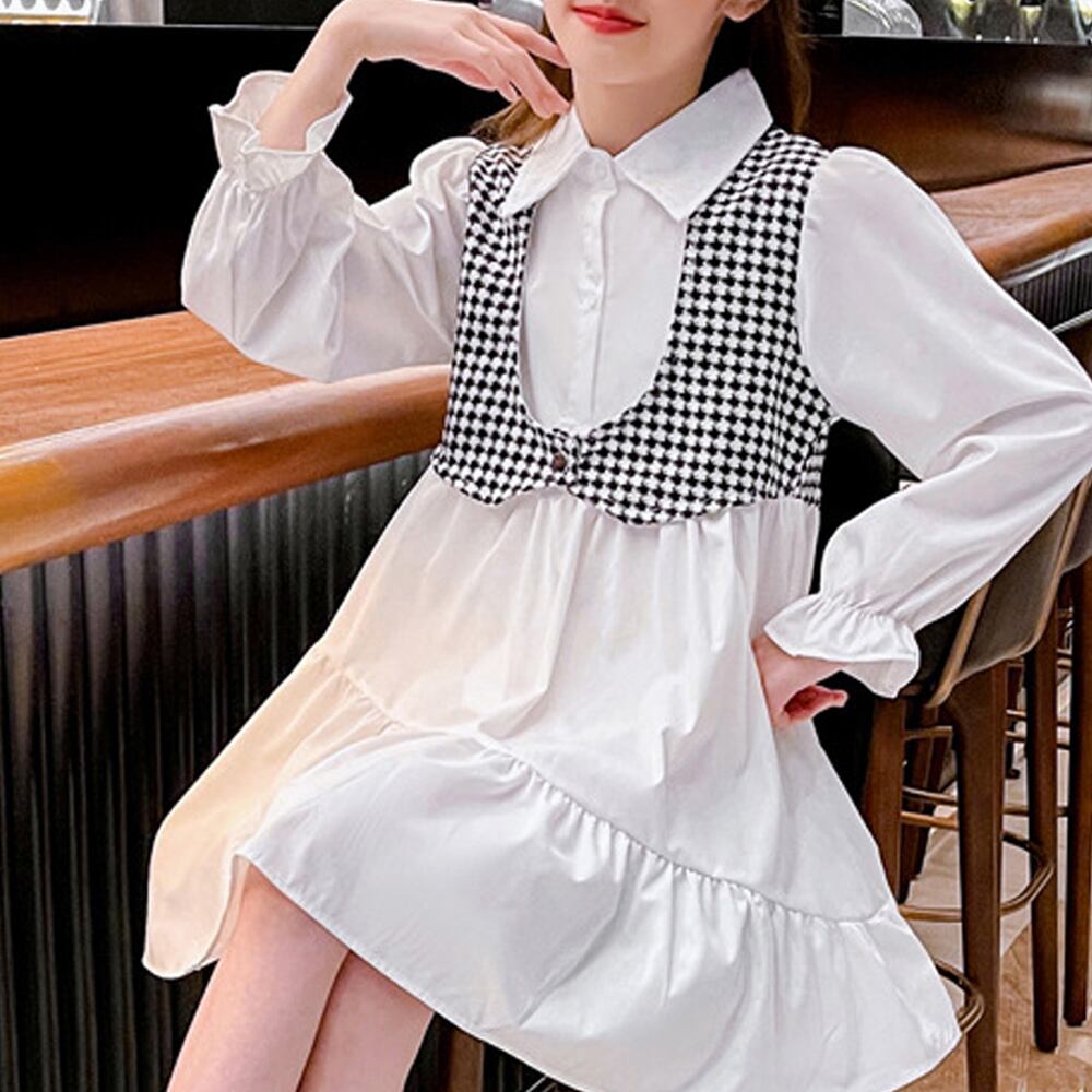 キッズワンピース 子供服 女の子 韓国風 双子 お揃い おしゃれ ドッキングワンピ ミニワンピース姉妹オールインワン カジュアル 春秋服 通学着小学生中学生おしゃれな女の子用ドッキングデザインシャツワンピース 。千鳥格子のデザインがかわいくておしゃれ感をプラス。これ一枚でコーデが決まる主役級ワンピース♪素材:綿65%+ポリエステル35%カラー:ホワイト*チェック柄サイズ:120/130/140/150/160※詳細は下記の「サイズ」を必ずご参考にしてご購入ください。[120]総丈:約67cm 肩幅:約26cm 袖丈:約41cm 身幅:約34cm 胸囲:約68cm ウエスト:約62cm[130]総丈:約72cm 肩幅:約28cm 袖丈:約44cm 身幅:約36cm 胸囲:約72cm ウエスト:約66cm[140]総丈:約76cm 肩幅:約30cm 袖丈:約47cm 身幅:約38cm 胸囲:約76cm ウエスト:約70cm[150]総丈:約78cm 肩幅:約30cm 袖丈:約50cm 身幅:約40cm 胸囲:約80cm ウエスト:約74cm[160]総丈:約84cm 肩幅:約34cm 袖丈:約51cm 身幅:約42cm 胸囲:約84cm ウエスト:約78cm裏地:なし伸縮性:なし透け感:ホワイト部分ややあり生産国:中国※すべて平置きサイズです(採寸方法違いより、多少の誤差がございますので、ご了承ください)。※海外輸入品のため、商品の細部仕様は多少異なる場合がございます。予めご了承の上、ご注文お願い致します。