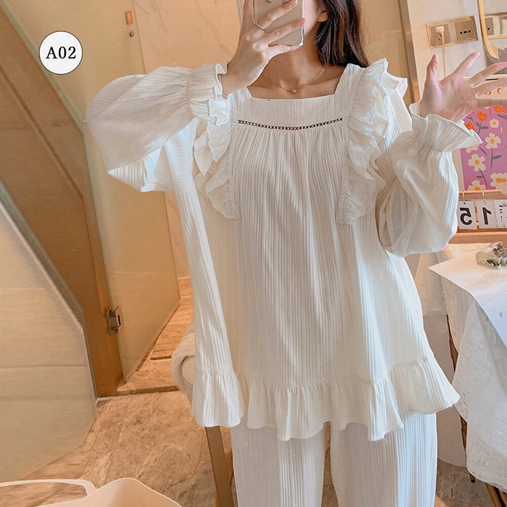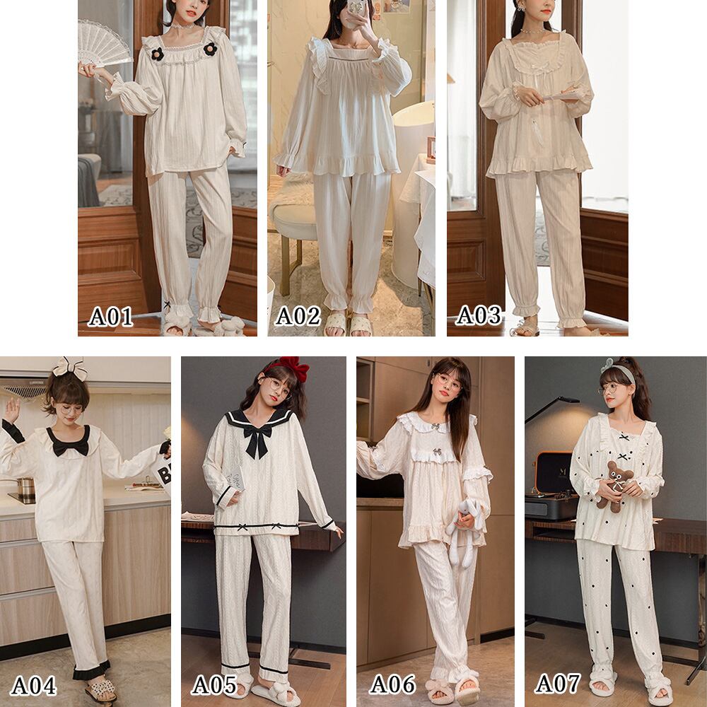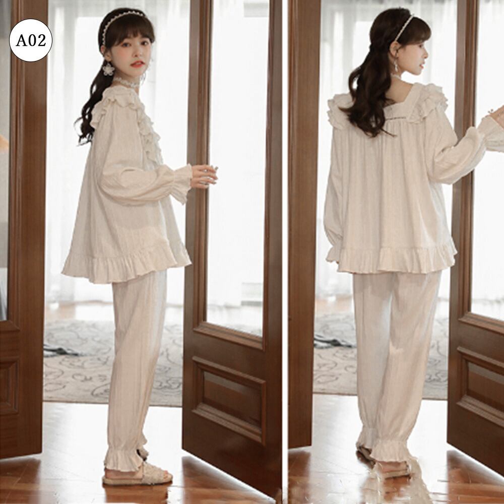 長袖 レディース 部屋着セットアップ 韓国ファッション 白お姫系寝巻き フリル裾長袖 長ズボン 大人 ナイトウェア春秋冬2点セット 寝間着 リラックス お泊り 女子会 パーティーキュートでガーリーな雰囲気がステイホームの時間をハッピーにしてくれるルームウェアセットアップ柔らかな綿混生地でふんわりと優しい肌当たり【大人気7タイプ展開】、お家でのリラックスタイムにはもちろん、宿泊行事にもおすすめ素材:綿75%+ポリエステル25%タイプ:A01-A07サイズ:ワンサイズ(XXL)トップス:着丈:約66cm 肩幅:約30cm 袖丈:約64cm ゆき:約79cm 身幅:約58cm 胸囲:約116-136cmボトムス:着丈:約96cm 股下:約67cm ウエスト(ゴム仕様):約58-110cm ヒップ:約110-128cm もも周り:約62-80cm裏地:なし伸縮性:あり透け感:若干あり生産国:中国※すべて平置きサイズです(採寸方法違いより、多少の誤差がございますので、ご了承ください)。※海外輸入品のため、商品の細部仕様は多少異なる場合がございます。予めご了承の上、ご注文お願い致します。