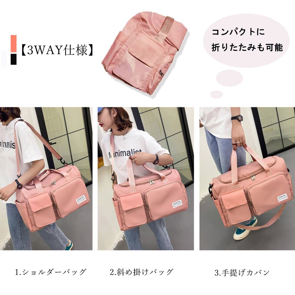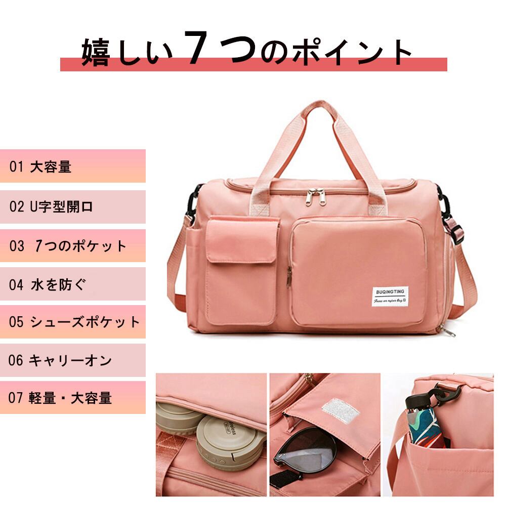 キャリーオンバッグ 男女兼用 トラベルバッグ 出張合宿 シューズ収納 ロンバッグ 機内持ち込み 1泊2泊 3wayバッグジムバッグおしゃれ スポーツバッグ軽量 旅行バッグ修学旅行旅行・アウトドア・スポーツなど使い方色々の3WAY大容量ボストンバッグすぐに取り出したい小物から、服や靴、雑誌、A4ファイル、ノートPCなど様々なアイテムを収納可能キャリーバッグの上に取り付け、キャリーオンバッグとしても使える水やキズに強い生地を使用、大切なお荷物が濡れないように 。砂や汚れで持ち運びに困る靴もメインポケットと別収納普段使いから旅行やジムにも使えて合わせやすいデザインと丈夫さは、毎日使いたくなる。素材:ナイロン+ポリエステルカラー:ブラック/グレー/ブルーグレー/ラベンダー/コーラルピンク/パープルサイズ:高さ:約26cm 底横幅:約45cm マチ:約18.5cm 持ち手高さ:約20cm(調節不可、取り外し不可) ショルダー:約75-124cm(調節可能、取り外し可能)重さ:約443g裏地:あり内ポケット:あり生産国:中国※すべて平置きサイズです(採寸方法違いより、多少の誤差がございますので、ご了承ください)。※海外輸入品のため、商品の細部仕様は多少異なる場合がございます。予めご了承の上、ご注文お願い致します。
