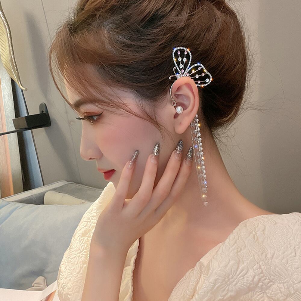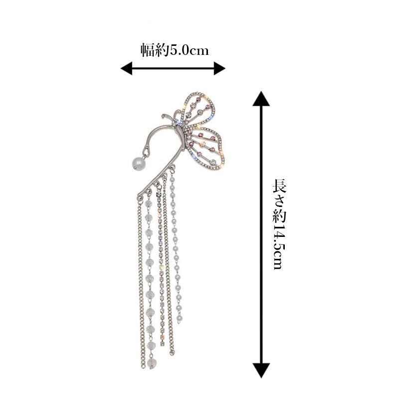 おしゃれ 韓国風 蝶々モチーフ 片耳イヤーカフ ジュエリーアクセサリー パーティー 耳飾り きらきらビジュー プチプラ20代30代揺れる フェイクパール華奢 イヤリング 結婚式耳元に華やかなアクセントを添える左耳用蝶々モチーフイヤーカフ長めのチェーンが耳元で揺れて、着こなしのポイントになるデザインカジュアルスタイルにもパーティーシーンにも活躍する万能アイテム素材:ラインストーン+フェイクパール+合金カラー:シルバーサイズ:幅約5.0cm x長さ約14.5cm生産国:中国※包装に関しての注意点:こちらの商品は激 安で販売しているため、化粧箱は付いていませんが、商品に傷付かないよう簡易包装で発送とさせていただきます。※海外輸入品のため、商品の細部仕様は多少異なる場合がございます。予めご了承の上、ご注文お願い致します。