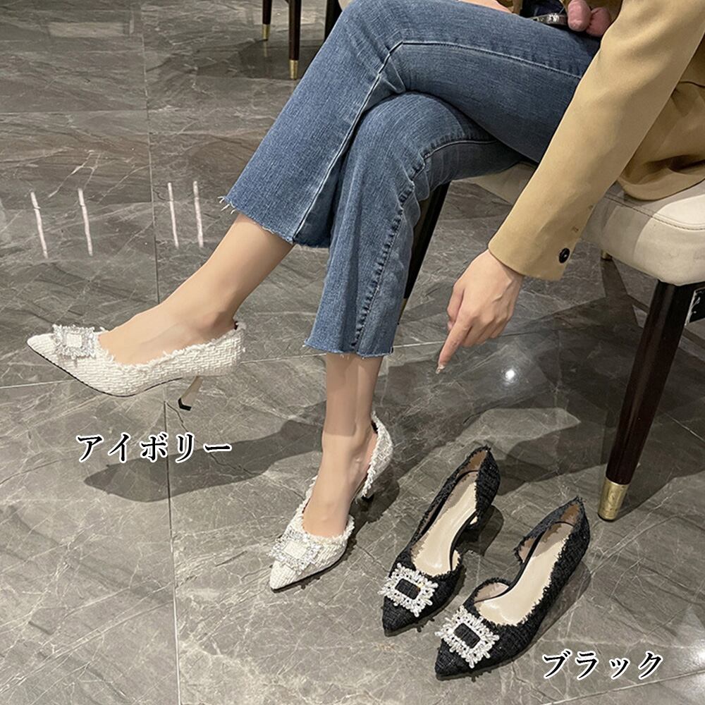 【日本倉庫即納】 ツイードパンプス ポインテッドトゥ 華奢