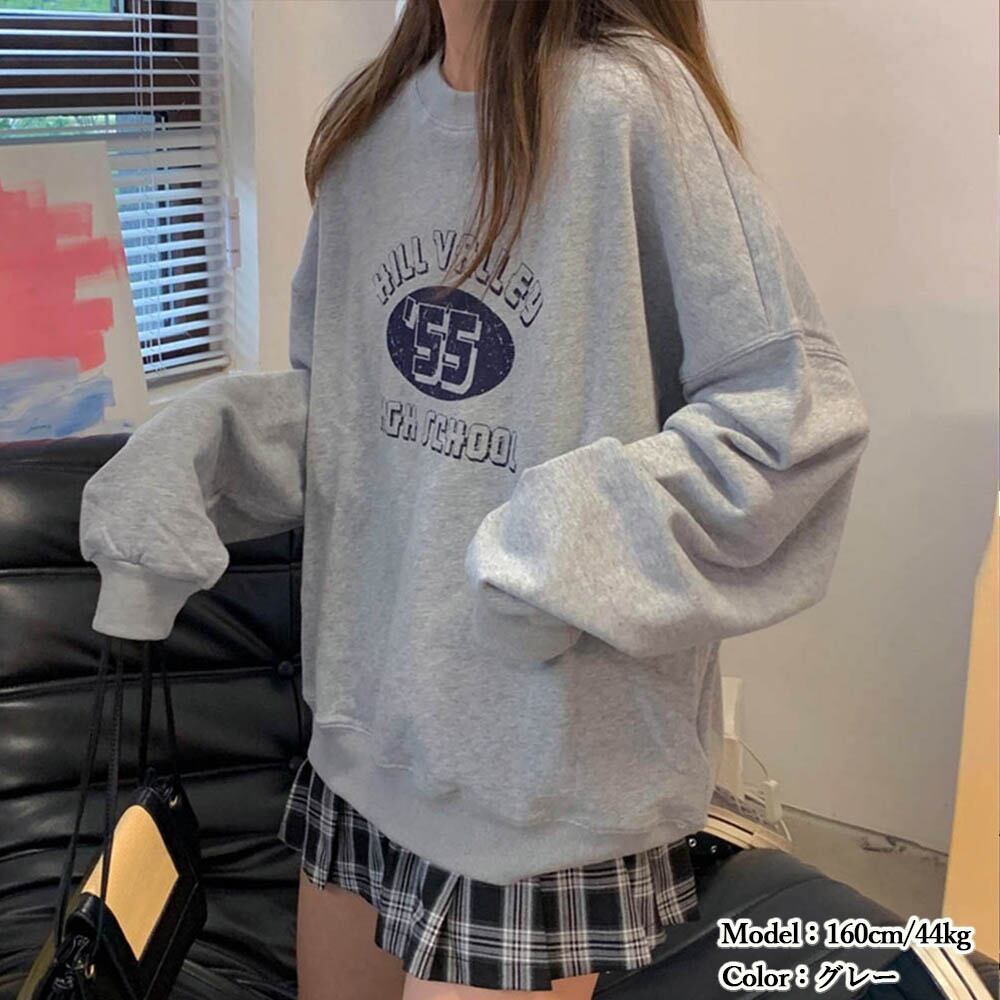 長袖 ラウンドネック ゆったり 大人女性 カジュアル トップス 韓国風 ビッグシルエット ドロップショルダーオーバーサイズ ストリートトップス プルオーバーフロントの英字プリントがポイントのトレーナーラウンドロゴが可愛い抜け感とカジュアル感を演出、体型カバーもバッチリのアイテムトレンドのワイドパンツやスウェットパンツと合わせたコーデがオススメTシャツやハイネックと合わせてレイヤードしても○素材:ポリエステル75%+綿25%カラー:グレージュ/グレー/ネイビー/グリーンサイズ:ワンサイズ着丈:約68cm 袖丈:約54cm ゆき:約87cm 身幅:約64cm 胸囲:約128cm裏地:なし伸縮性:なし透け感:なし生産国:中国※すべて平置きサイズです(採寸方法違いより、多少の誤差がございますので、ご了承ください)。※海外輸入品のため、商品の細部仕様は多少異なる場合がございます。予めご了承の上、ご注文お願い致します。