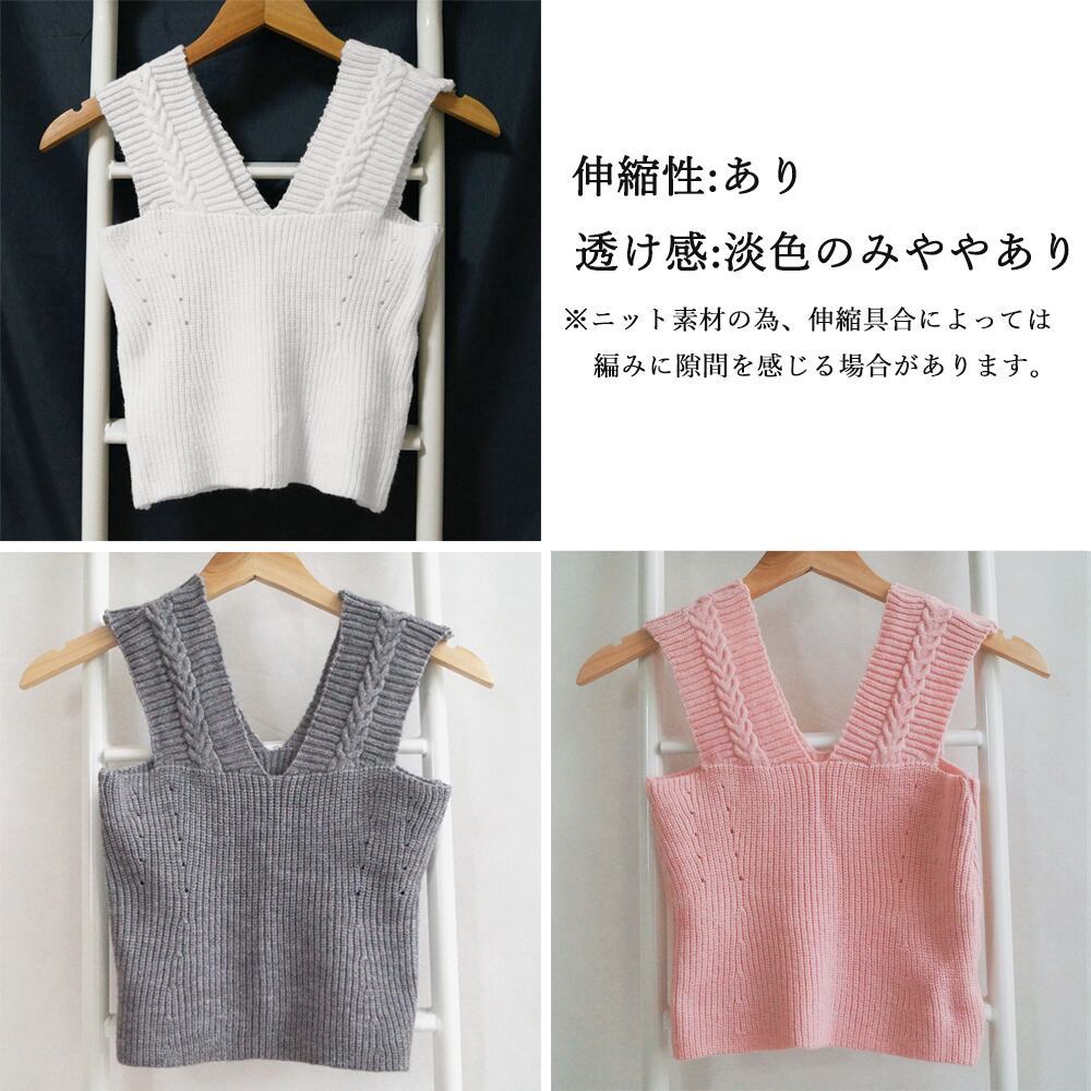 レディース ノースリーブ ショート丈トップス Vネック 重ね着 リブニット 韓国ファッション ニットベスト 通勤通学肌見せ 着回し ニットトップス レイヤード お洒落ロングシーズンで着られる可愛いニットタンクトップ深めのVネックデザインでデコルテを綺麗に見せてくれるショート丈なのでレイヤードしても重たくならず裾からシャツやブラウスが見えてお洒落素材:ポリエステル75%+アクリル25%カラー:ホワイト/ブラック/グレー/ピンクサイズ:ワンサイズ着丈:約39cm 身幅:約33cm 胸囲:約66-88cm裏地:なし伸縮性:あり透け感:淡色のみややあり※ニット素材の為、伸縮具合によっては編みに隙間を感じる場合があります。生産国:中国※すべて平置きサイズです(採寸方法違いより、多少の誤差がございますので、ご了承ください)。※海外輸入品のため、商品の細部仕様は多少異なる場合がございます。予めご了承の上、ご注文お願い致します。
