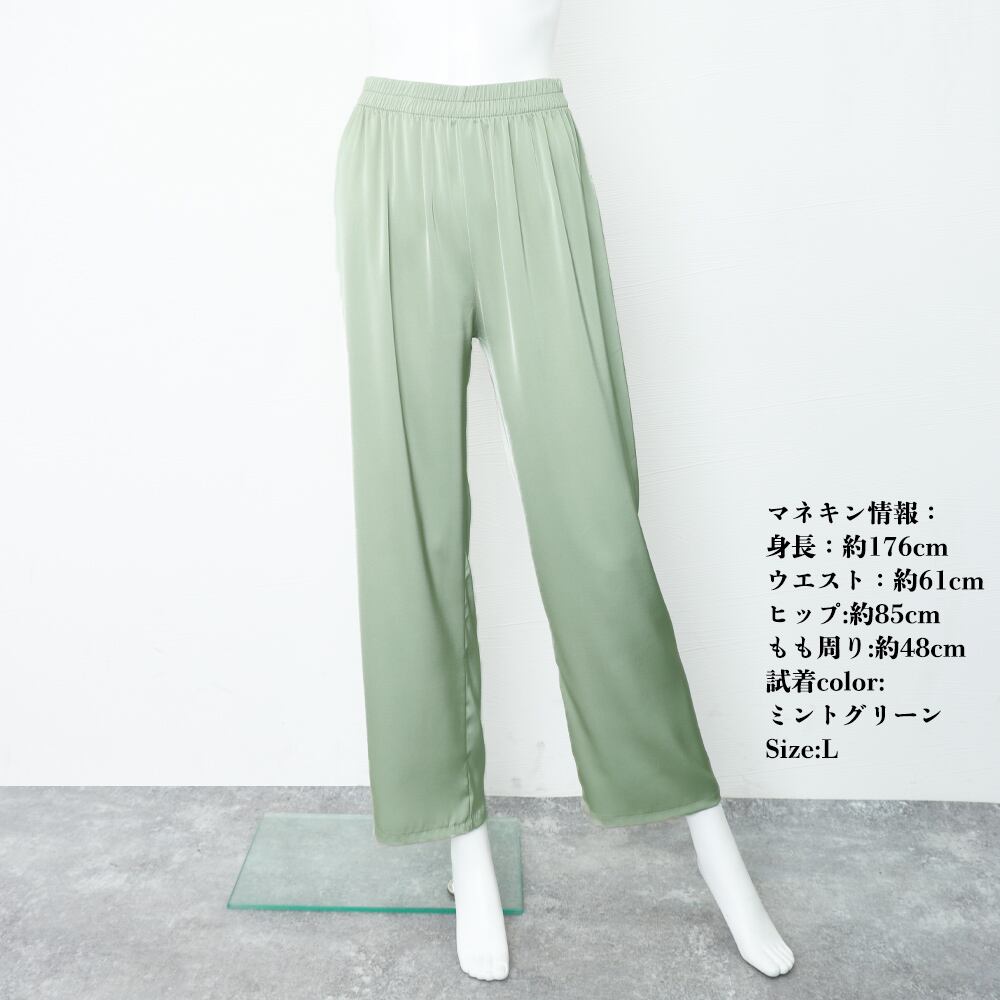 セミワイドパンツ ロングパンツ ハイウエスト ウエストゴム おしゃれ 脚長パンツ カジュアル 着やせ リラックスストレートパンツ ボトムス ゆったり 韓国ファッション微光沢があり、ドレープ感のある滑らかな素材を使用したセミワイドパンツ。ウエストはゴム仕様になっているので、ストレスなく着用出来る。定番のブラックやアイボリーをはじめ、コーディネートの差し色になる旬のカラー展開にも注目。素材:ポリエステル100%カラー:ブラック/アイボリー/グレー/ブルー/ミントグリーン/ピンクサイズ:M/L[M]着丈:約96cm 股下:約66cm ウエスト(ゴム仕様):約60-92cm ヒップ:約96cm もも周り:約54cm[L]着丈:約97cm 股下:約67cm ウエスト(ゴム仕様):約62-94cm ヒップ:約100cm もも周り:約56cm裏地:なし伸縮性:なし透け感:アイボリーのみややあり生産国:中国※すべて平置きサイズです(採寸方法違いより、多少の誤差がございますので、ご了承ください)。※海外輸入品のため、商品の細部仕様は多少異なる場合がございます。予めご了承の上、ご注文お願い致します。