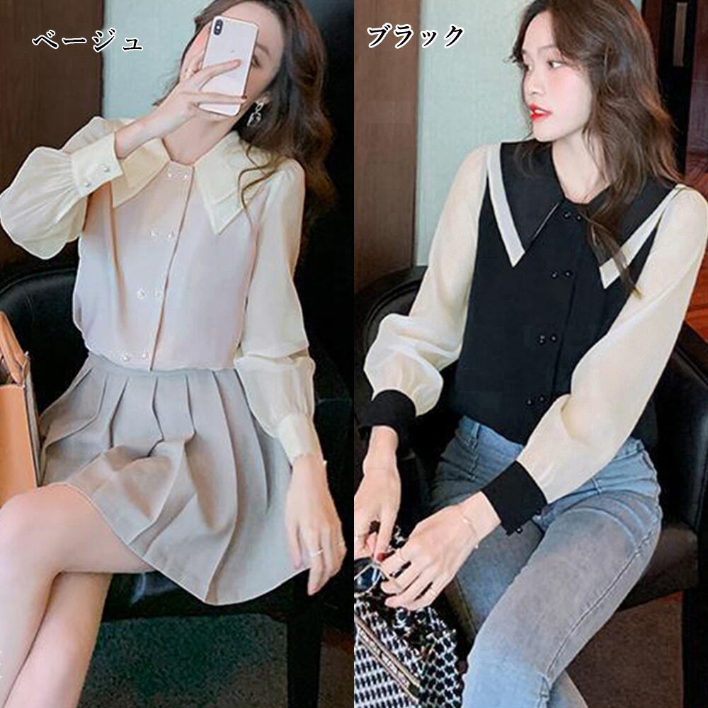 韓国シャツブラウス きれいめ エレガント ブラウス 白黒 バイカラートップス 春夏秋 着やせ オフィスカジュアルおしゃれ20代30代40代 薄手シャツ通勤OL 上品 大人ブラウスダブルボタンとダブル襟でデザインされた前立てがお洒落なシフォンブラウスゆったりとした着心地で気負いなく着こなせるのに、フェミニンな女性らしさを後押ししてくれるオフィスカジュアル(オフィス ビジネス 通勤 営業)や通勤ファッションとしても活躍し、オン・オフ使える活躍の場が広いアイテム素材:ポリエステル100%カラー:ブラック/ベージュサイズ:M/L[M]着丈:約58cm 肩幅:約36cm 袖丈:約56cm ゆき:約74cm 身幅:約49cm 胸囲:約98cm[L]着丈:約60cm 肩幅:約38cm 袖丈:約58cm ゆき:約77cm 身幅:約56cm 胸囲:約112cm裏地:なし伸縮性:なし透け感:ベージュのみややあり生産国:中国※すべて平置きサイズです(採寸方法違いより、多少の誤差がございますので、ご了承ください)。※海外輸入品のため、商品の細部仕様は多少異なる場合がございます。予めご了承の上、ご注文お願い致します。