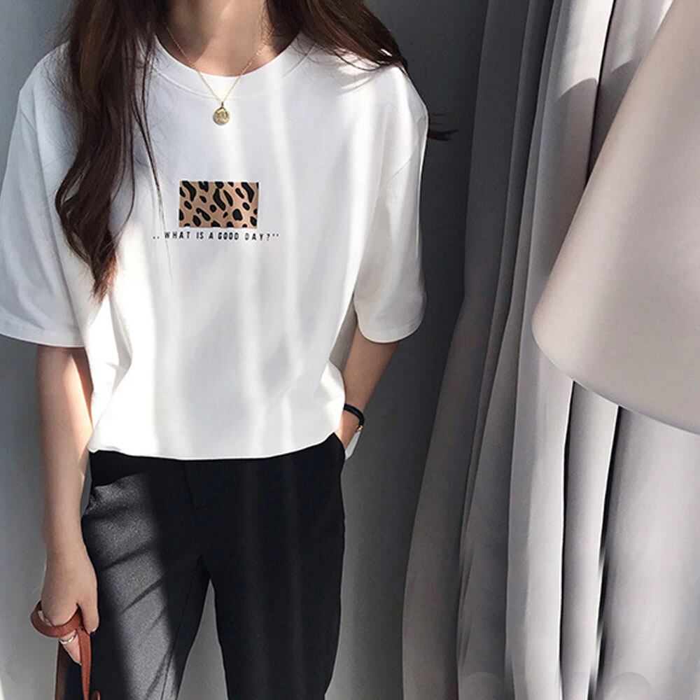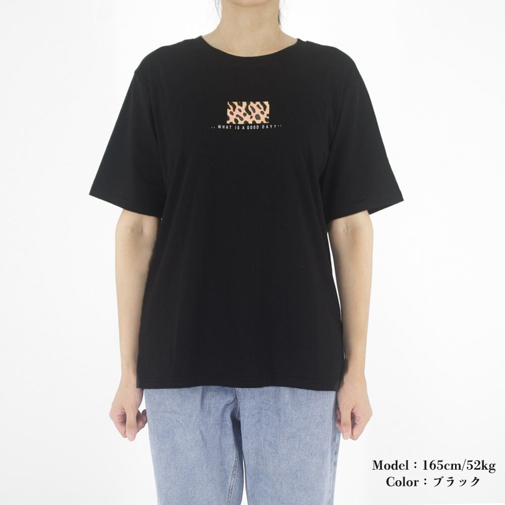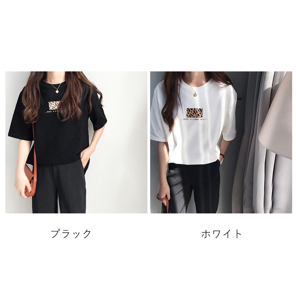 カットソー レオパード プリント 体型カバートップス フロントロゴt プルオーバー カジュアル おしゃれtシャツ 夏春秋新作人気Tシャツ クルーネックT ゆったりTシャツベーシックなデザインでインでもアウトでも着られるTシャツ英字ロゴとレオパード柄のプリントの組み合わせがカジュアルスタイルを完成させるシンプルなデザインでボトム次第で様々なスタイリングが可能な万能アイテム素材:ポリエステル62%+綿33%+ポリウレタン5%カラー:ブラック/ホワイトサイズ:ワンサイズ着丈:約64cm 肩幅:約40cm 袖丈:約22cm ゆき:約44cm 身幅:約47cm 胸囲:約94-104cm裏地:なし伸縮性:ややあり透け感:ホワイトのみややあり生産国:中国※すべて平置きサイズです(採寸方法違いより、多少の誤差がございますので、ご了承ください)。※海外輸入品のため、商品の細部仕様は多少異なる場合がございます。予めご了承の上、ご注文お願い致します。