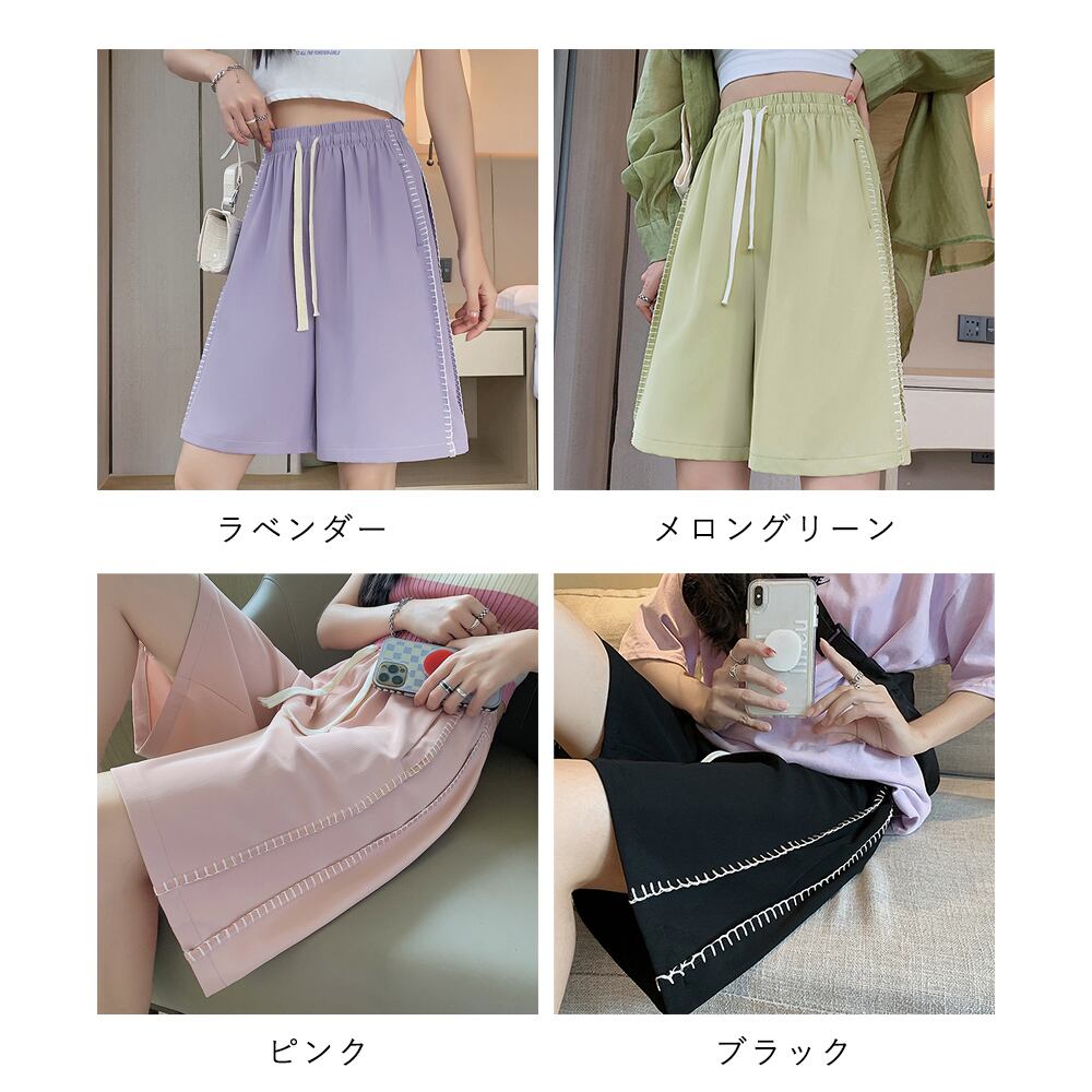 レディースパンツ Aライン ウエストゴム イージーパンツ ショーパン リラックス 部屋着 運動着 カジュアル 楽ちん体型カバーズボン ハイウエストパンツ 着やせ ボトムス シンプルな形でコーディネートしやすい、ベーシックな4色展開のハーフパンツウエストゴム仕様でストレスフリーなはき心地も魅力普段着、運動シーンからリラックスタイムまで幅広く着回せる素材:ポリエステル100%カラー:ブラック/メロングリーン/ピンク/ラベンダーサイズ:M/L[M]着丈:約52cm 股下:約18cm ウエスト(ゴム仕様):約60-80cm ヒップ:約96cm もも周り:約58cm[L]着丈:約54cm 股下:約19cm ウエスト(ゴム仕様):約64-84cm ヒップ:約100cm もも周り:約60cm裏地:なし伸縮性:なし透け感:なし生産国:中国※すべて平置きサイズです(採寸方法違いより、多少の誤差がございますので、ご了承ください)。※海外輸入品のため、商品の細部仕様は多少異なる場合がございます。予めご了承の上、ご注文お願い致します。