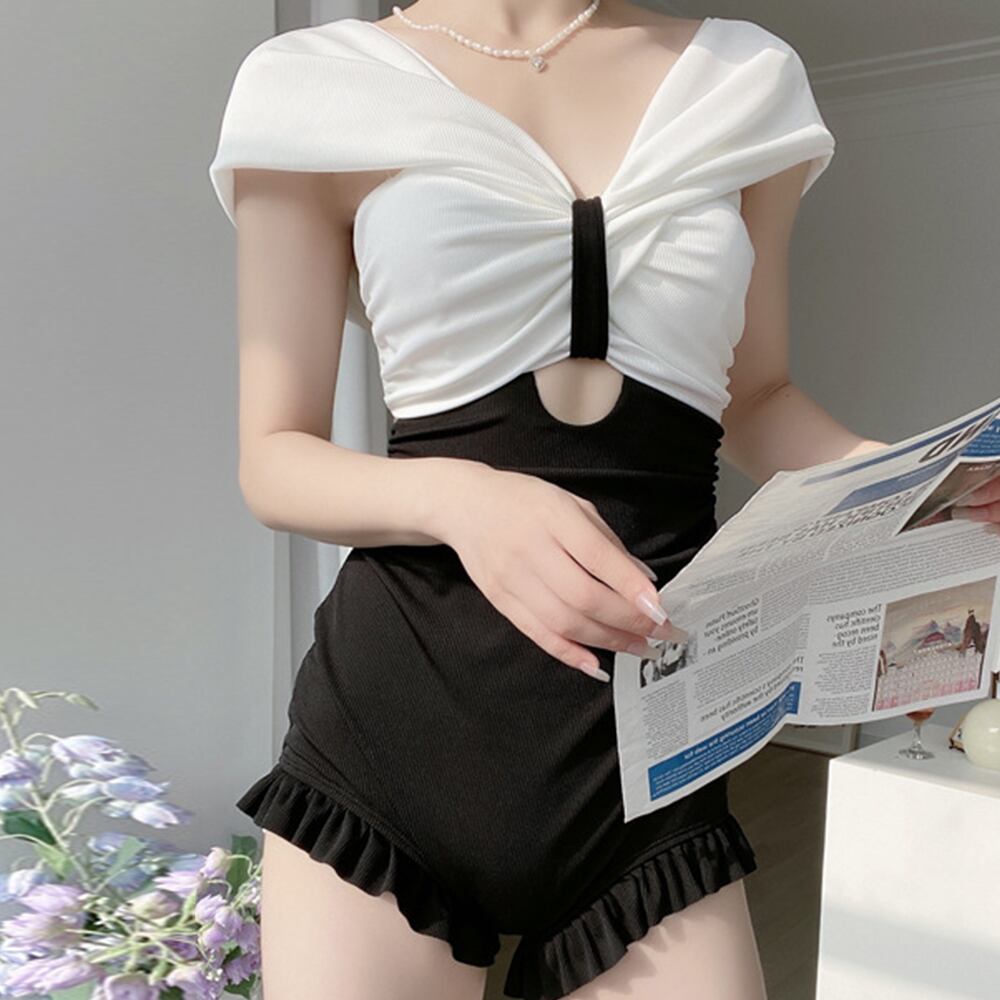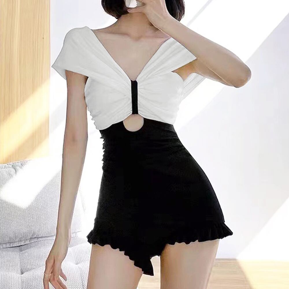 韓国風スイムウェア バイカラー バックオープン オールインワン水着 裾フリル オトナ女子 モノキニ 海水浴 プール 夏海お洒落水着 20代 盛れるプール水着 背中開きモノキニVラインの胸元とちらっと肌見せがセクシーなオールインワン水着裾はフリル付きで可愛らしさもプラスハイウエスト仕様で露出度は意外と控えめで、オトナ女子やおしゃれママさんにもおススメ海外旅行・プール遊び・温泉施設などで注目度UP素材:ポリエステル85%+ポリウレタン15%カラー:ホワイト*ブラックサイズ:ワンサイズ着丈:約55cm バスト:約70-98cm ウエスト:約60-90cm ヒップ:約68-100cm もも周り:約48-70cm商品詳細:・パッド:あり(取り外し可能)・パッド挿入可・ワイヤー:なし裏地:前身頃部分のみあり伸縮性:あり透け感:なし生産国:中国※すべて平置きサイズです(採寸方法違いより、多少の誤差がございますので、ご了承ください)。※海外輸入品のため、商品の細部仕様は多少異なる場合がございます。予めご了承の上、ご注文お願い致します。