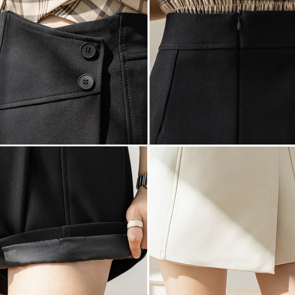 Aライン キュロットスカート 韓国 ハイウエスト 着やせミニスカパン 見せパン付き きれいめ ミニスカート 台形 春秋夏ショーパン美脚脚長 着やせ短パンお洒落 オフィスカジュアルラップスカート見えするショートパンツ中がしっかりとパンツの作りになっていてミニ丈でも安心ハイウエストですっきりとしたウエストと、タイトすぎず広がりを抑えた絶妙なフレアシルエットが、大人っぽい印象きれいめにもカジュアルにも着こなせ、ロングシーズン活躍するアイテム表地素材:ポリエステル90%+綿10%裏地素材:ポリエステル100%カラー:ブラック/アイボリーサイズ:S/M/L[S]スカート丈:約34cm ウエスト:約64cm 股下:約8.5cm ヒップ:約92cm もも周り:約60cm[M]スカート丈:約35cm ウエスト:約68cm 股下:約8.5cm ヒップ:約96cm もも周り:約63cm[L]スカート丈:約36cm ウエスト:約72cm 股下:約8.5cm ヒップ:約100cm もも周り:約66cm裏地:あり伸縮性:なし透け感:なし生産国:中国※すべて平置きサイズです(採寸方法違いより、多少の誤差がございますので、ご了承ください)。※海外輸入品のため、商品の細部仕様は多少異なる場合がございます。予めご了承の上、ご注文お願い致します。