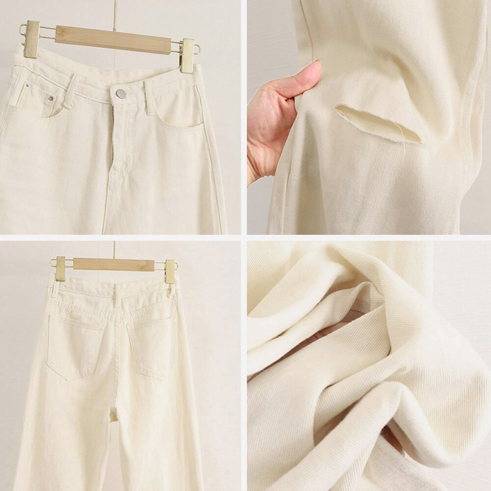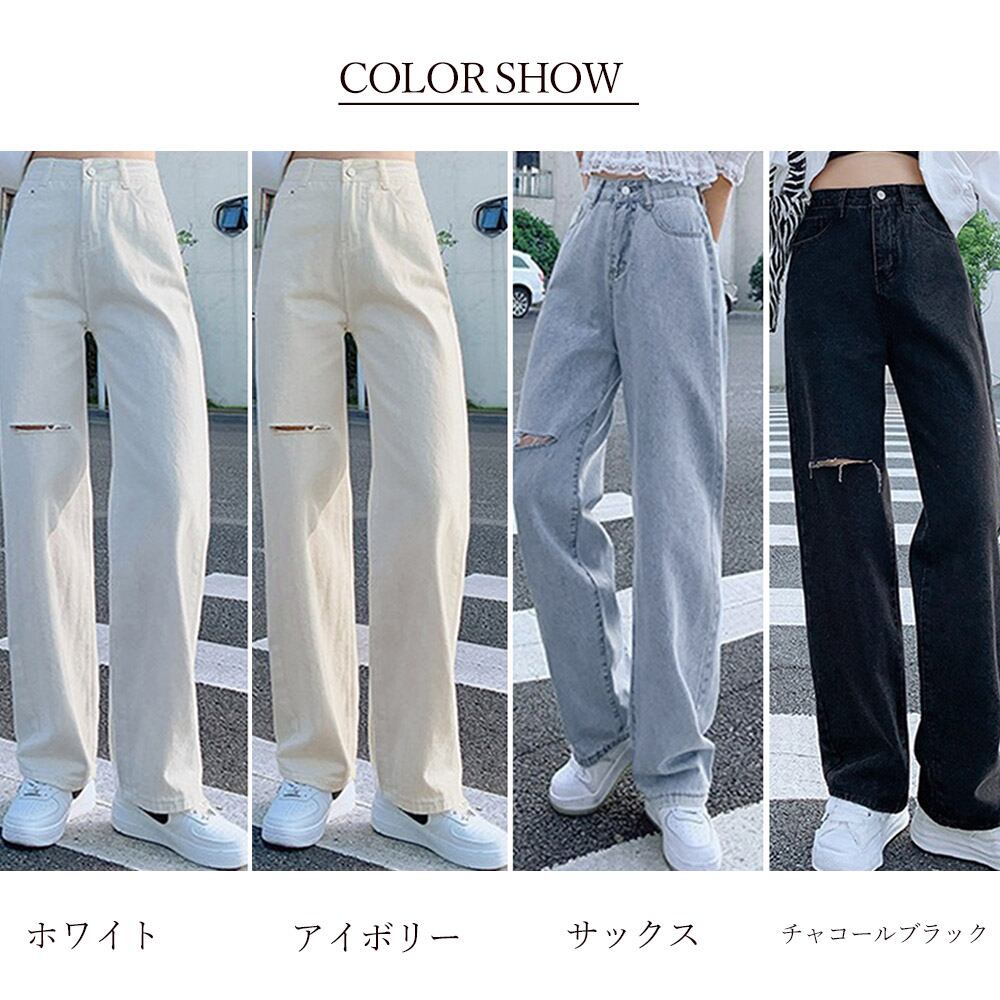 レディース ゆったり デニムワイドパンツ ハイウエスト ジーパン オシャレ カジュアルロングパンツ 脚長ボトムス 春秋夏ストリートデニム ヴィンテージデニム セミワイドデニムゆったりとしたシルエットで履き心地が良いデニムワイドパンツハイウエストデザインなので、脚が長く見える膝あたり程よいダメージ加工が施されており、トレンド感があふれるカジュアルにはスニーカーと合わせるのがおすすめ、パンプスなどのきれいめな靴と合わせても大人っぽく見える素材:ポリエステル70%+綿30%カラー:チャコールブラック/サックス/ホワイト/アイボリーサイズ:S/M/L/XL[S]着丈:約99cm 股下:約69cm ウエスト:約67cm ヒップ:約88cm もも周り:約54cm[M]着丈:約100cm 股下:約70cm ウエスト:70cm ヒップ:約94cm もも周り:約56cm[L]着丈:約101cm 股下:約71cm ウエスト:約73cm ヒップ:約100cm もも周り:約58cm[XL]着丈:約102cm 股下:約72cm ウエスト:約77cm ヒップ:約106cm もも周り:約60cm裏地:なし伸縮性:なし透け感:なし生産国:中国※すべて平置きサイズです(採寸方法違いより、多少の誤差がございますので、ご了承ください)。※海外輸入品のため、商品の細部仕様は多少異なる場合がございます。予めご了承の上、ご注文お願い致します。