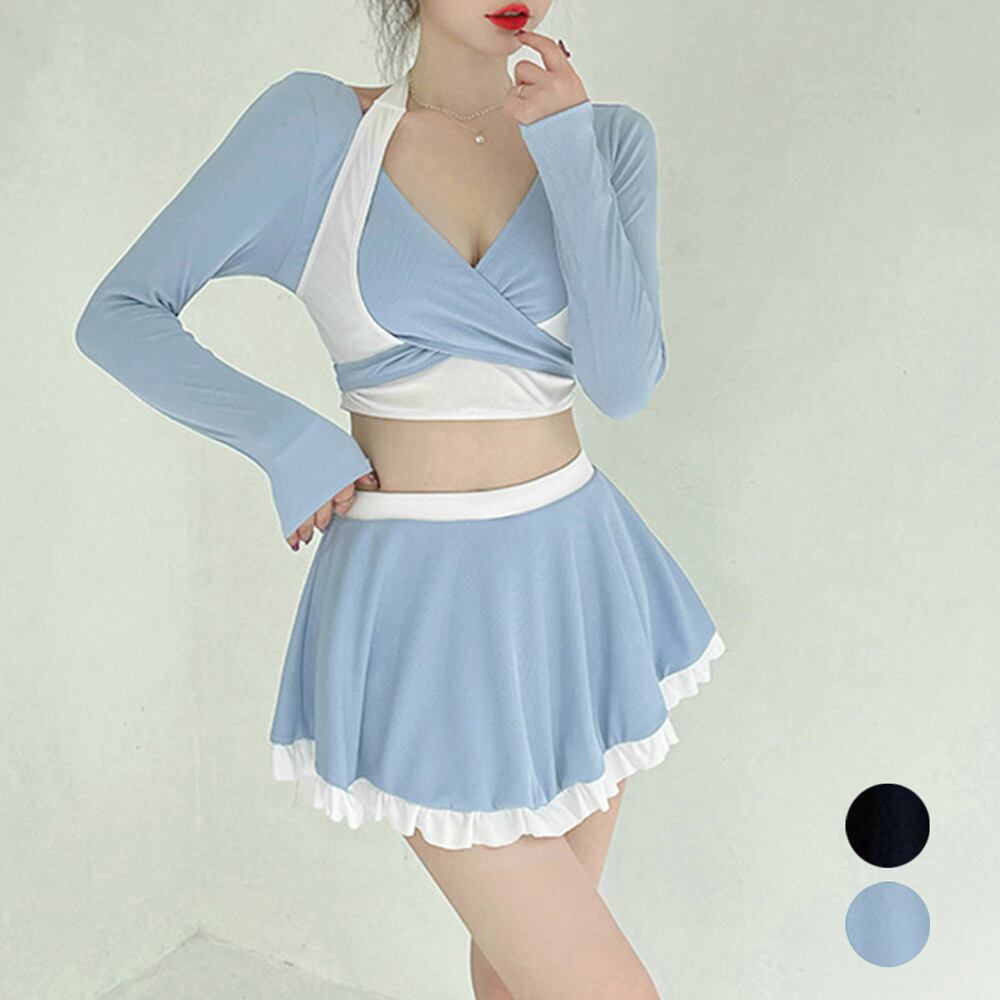 ホルターネック水着 クロスバンドゥビキニ 韓国風水着セット 長袖 ビキニスカート リゾート旅行 プール遊び ビーチ可愛いスイムウェアー 海 海水浴女の子ビキニ 水陸両用盛れる水着大人かわいいの体型カバー、お洒落に肌チラ見せフリル仕様韓国風タンキニ水着2点セット胸元のクロスデザインとしっかりめのホルターがバストを包み込み、キレイにバストメイクしてくれるスカートはフレアに広がるデザインで、腰回りをカバーし楽に着られる清楚でオトナ可愛いデザイン、リゾート旅行でもプール遊びでも注目されるスイムウェアトップス素材:ポリエステル85%+ポリウレタン15%ボトムス素材: ポリエステル85%+ポリウレタン15%カラー:ブラック/ライトブルーサイズ:ワンサイズトップス着丈:約35cm 袖丈:51cm トップバスト:約80-100cm アンダーバスト:約64-100cmボトムス着丈:約34cm ウエスト(ゴム仕様):約54-94cm ヒップ:約72-106cm もも周り:約46-78cm商品詳細:・パッド:あり(取り外し可能)・パッド挿入可・ワイヤー:なし裏地:なし伸縮性:あり透け感:なし生産国:中国※すべて平置きサイズです(採寸方法違いより、多少の誤差がございますので、ご了承ください)。※海外輸入品のため、商品の細部仕様は多少異なる場合がございます。予めご了承の上、ご注文お願い致します。