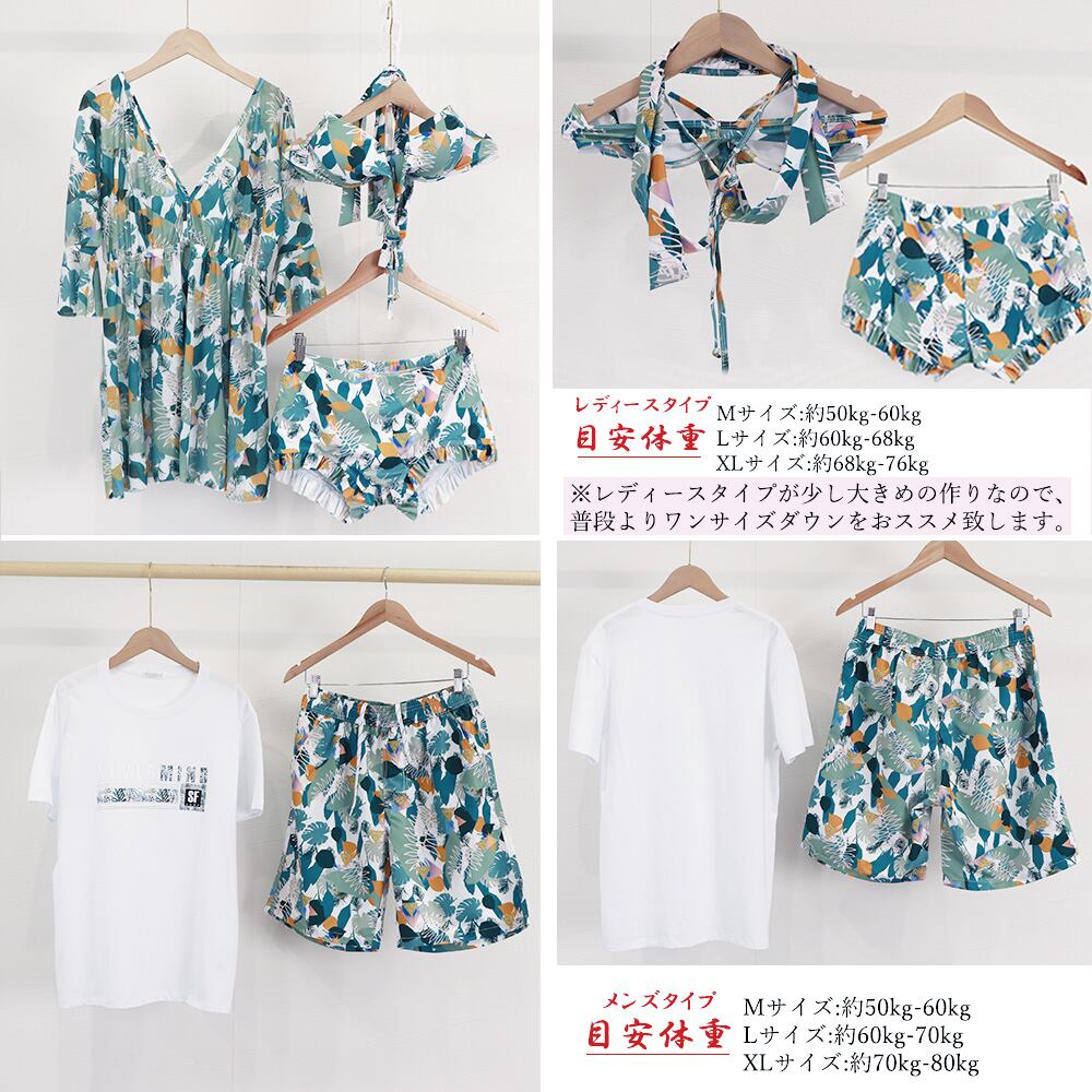 おしゃれ 花柄水着 ペアルック メンズ水着 上下セット レディース水着 3点セット 体型カバー リゾートウェア 新婚旅行ビーチウエア着やせ ラッシュガード韓国 ビキニ可愛い 夏海新婚旅行、リゾート地やビーチでのデートにぴったりの花柄ペア水着ですかわいいデザインで彩る女性用のスリーピース水着と男性用ショートパンツ、Tシャツ上下セットです男性用の水着は女性用と同じく花柄がプリントされており、カップルでお揃いのコーディネートを楽しむことができます思い出に残る旅行をより一層ロマンチックなものになりますメンズTシャツ素材: 綿95%+ポリエステル5%ボトムス素材: ポリエステル95%+綿5%レディースラッシュガード素材:ポリエステル85%+ポリウレタン15%水着素材:ポリエステル85%+ポリウレタン15%タイプ:メンズ/レディースサイズ:M/L/XLメンズTシャツ:着丈約69/70/71cm 肩幅約43/45/48cm 袖丈約20/20/20cm 胸囲約96-112/100-116/104-120cmボトムス:着丈約49/50/51cm ウエスト約68-96/70-100/76-106cm ヒップ約114/118/122cmレディースラッシュガード:着丈約71/72/73cm 袖丈約39/40/41cm ウエスト約62-114/68-120/72-124cm 胸囲フリーブラトップ:トップバスト約68-78/72-82/76-86cm アンダーバスト約66-76/68-78/70-80cmパンツ:着丈約23/23/23cm ウエスト約66-100/68-102/70-104cm ヒップ約86-106/90-110/94-114cmカップ:ありパッド:あり(取り外し可能)/挿入可ワイヤー:あり生産国:中国※すべて平置きサイズです(採寸方法違いより、多少の誤差がございますので、ご了承ください)。※海外輸入品のため、商品の細部仕様は多少異なる場合がございます。予めご了承の上、ご注文お願い致します。