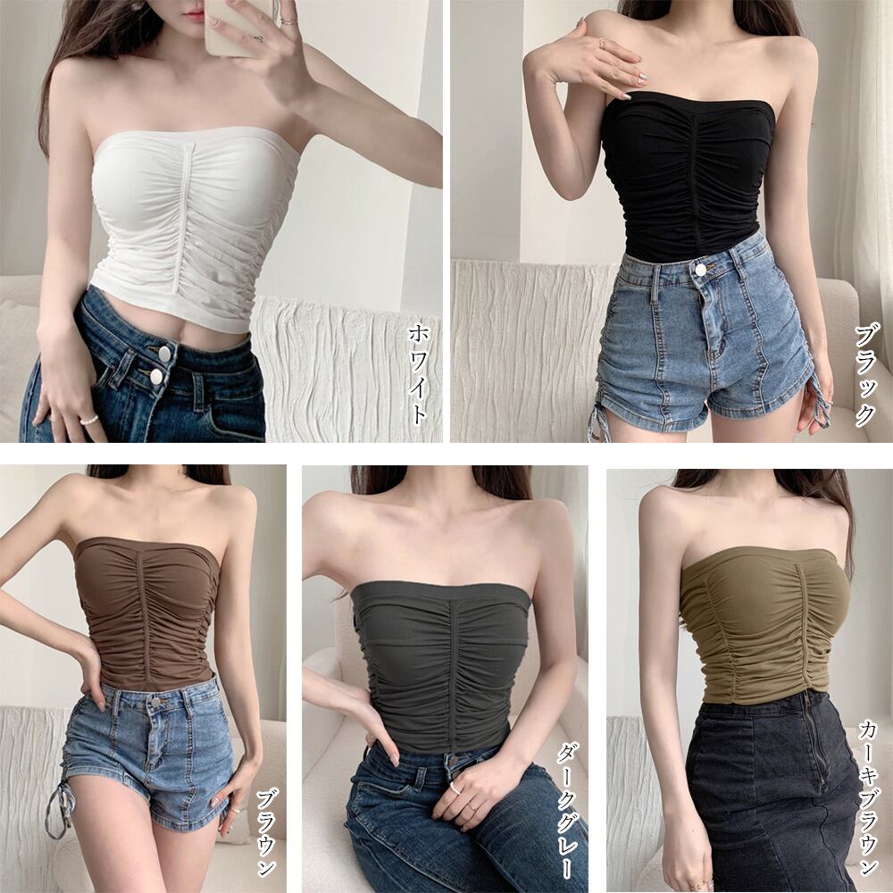 チラ見え防止 ブラトップ ギャザー オフショルダートップス ストレッチ ロング丈ベアトップ タイト 肌見せ 薄手トップス無地チューブトップ フィットベアトップ 肩出しトップス春夏胸元の開いた服装やオフショルダースタイルのインナー使いに最適なノンワイヤーブラチューブトップ全身にあしらわれたシャーリングがポイント一枚でも着れるし、ジャケットなどのインナーとしても着れて着回し力抜群素材:ポリエステル65%+綿35%カラー:ブラック/ホワイト/ブラウン/ダークグレー/カーキブラウンサイズ:ワンサイズ着丈約34cm 身幅:約31cm 胸囲:約62-120cmカップ:あり(取り外し不可)ワイヤー:なし裏地:胸元部分のみあり伸縮性:あり透け感:ホワイトのみややあり生産国:中国※すべて平置きサイズです(採寸方法違いより、多少の誤差がございますので、ご了承ください)。※海外輸入品のため、商品の細部仕様は多少異なる場合がございます。予めご了承の上、ご注文お願い致します。
