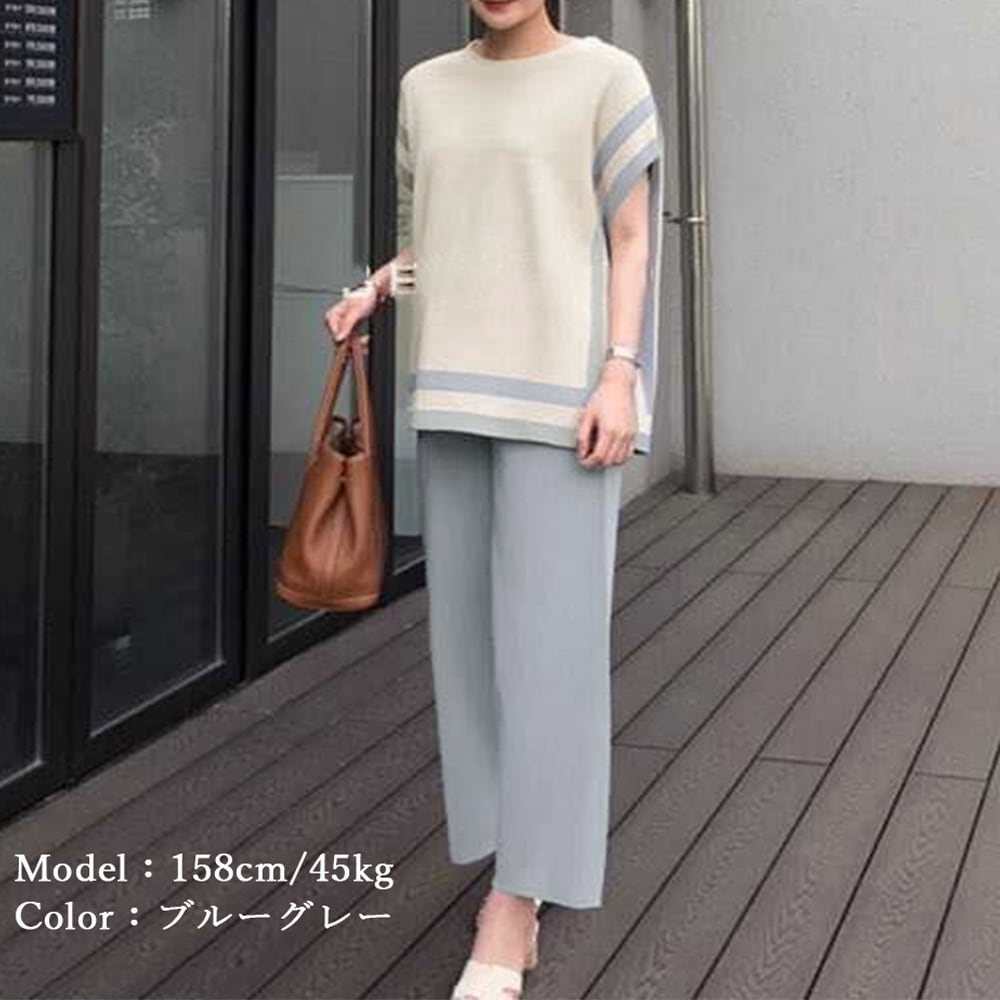 サマーニット スリットトップス ワイドパンツ 2点セット ゆったり オフィスカジュアル フレンチ袖ニット きれいめ 薄手配色 上下セット 韓国ファッション 20代30代40代きれいめで清楚にまとまるサマーニットとワイドパンツセットアップ二の腕をカバーしてくれるフレンチスリーブニットトップス脚元をスッキリ見せてくれるアンクル丈のワイドパンツほどよいバイカラー使いでシルエットにメリハリをプラスし、コーデに迷ったらこれを選ぶべきトップス素材:ポリエステル75%+アクリル25%ボトムス素材:ポリエステル75%+アクリル25%カラー:ブラック/ブルーグレーサイズ:ワンサイズトップス:着丈:約64cm 肩幅(袖丈含め):約61cm 身幅:約59cm 胸囲:約118-142cmボトムス:着丈:約86cm 股下:約57cm ウエスト(ゴム仕様):約60-96cm ヒップ:約98-124cm もも周り:約54-80cm裏地:なし伸縮性:あり透け感:なし生産国:中国※すべて平置きサイズです(採寸方法違いより、多少の誤差がございますので、ご了承ください)。※海外輸入品のため、商品の細部仕様は多少異なる場合がございます。予めご了承の上、ご注文お願い致します。