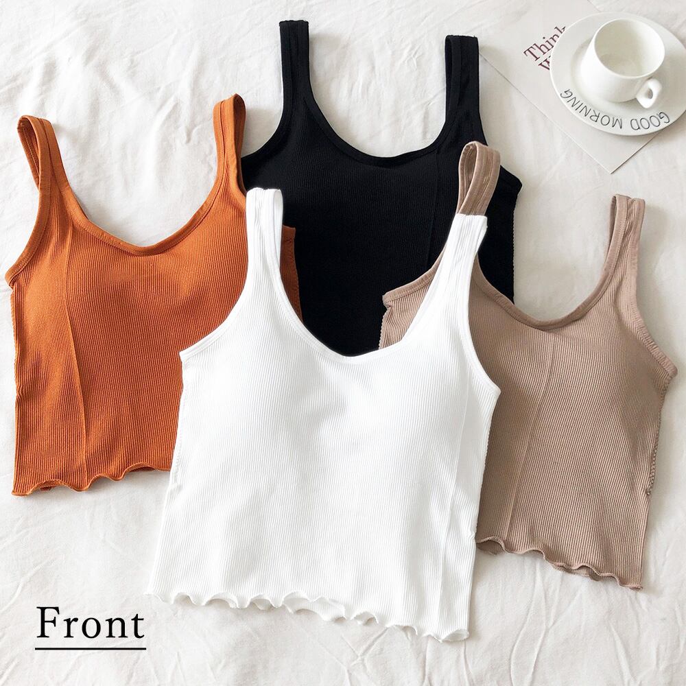 へそ出し サマーニット フィット感 ショート丈トップス フリル ノンワイヤー セクシー ブラトップリブニット 重ね着 韓国ファッション インナー 肌見せシンプルで使い勝手抜群のリブニットタンクトップ締め付け感のないノンワイヤー仕様夏ではそのまま1枚、少し肌寒い春秋では、デニムジャケットやブラウスなどと合わせるのもおすすめ素材:ポリエステル85%+ポリウレタン15%カカラー:ホワイト/ブラック/モカベージュ/オレンジキャメルサイズ:ワンサイズ着丈: 約43cmトップバスト:約54-78cmアンダーバスト:約52-76cmワイヤー:なしカップ:あり(取り外し不可) 裏地:カップ部分のみあり透け感:ホワイトのみカップ部分以外ややあり生産国:中国※すべて平置きサイズです(採寸方法違いより、多少の誤差がございますので、ご了承ください)。※海外輸入品のため、商品の細部仕様は多少異なる場合がございます。予めご了承の上、ご注文お願い致します。