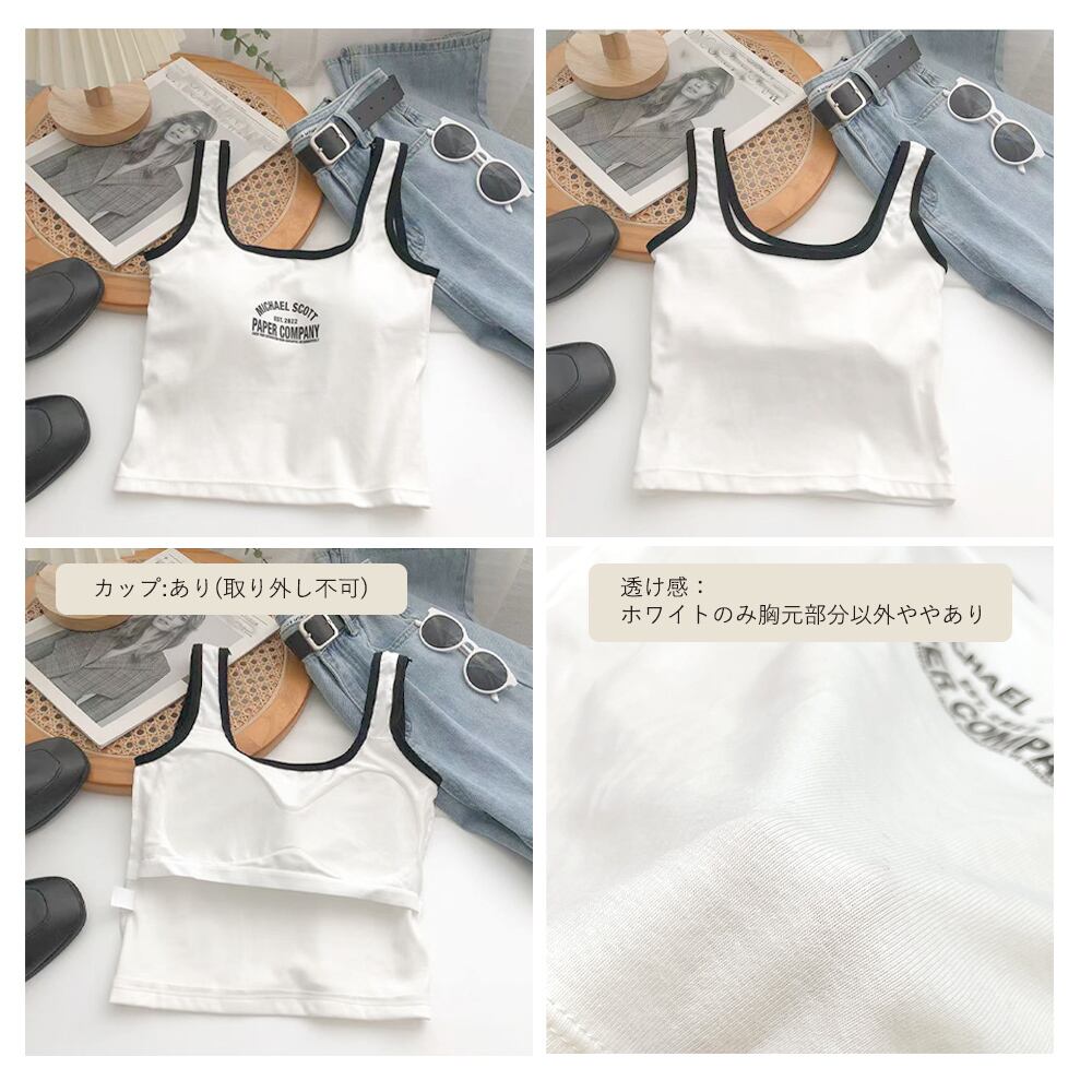 薄手 ショート丈 ロゴ入り キャミソール インナー へそ出し 重ね着 着回し 春夏秋 大人 カジュアル セクシー着やせ夏服キャミ カップ付きインナー 韓国ファッション短め丈のカップイン仕様、胸元のロゴデザインがポイントのタンクトップベーシックなカラーでブラック、ホワイトの使いやすい色合いショート丈のデザインで、デニムやワイドパンツと合わせても可愛く着ていただける素材:綿70%+ポリエステル30%カラー:ブラック/ホワイトサイズ:ワンサイズ総丈:約39cm 身幅:約29cm 胸囲:約58~88cmワイヤー:なしカップ:あり(取り外し不可)裏地:なし伸縮性:あり透け感:ホワイトのみ胸元部分以外ややあり生産国:中国※すべて平置きサイズです(採寸方法違いより、多少の誤差がございますので、ご了承ください)。※海外輸入品のため、商品の細部仕様は多少異なる場合がございます。予めご了承の上、ご注文お願い致します。