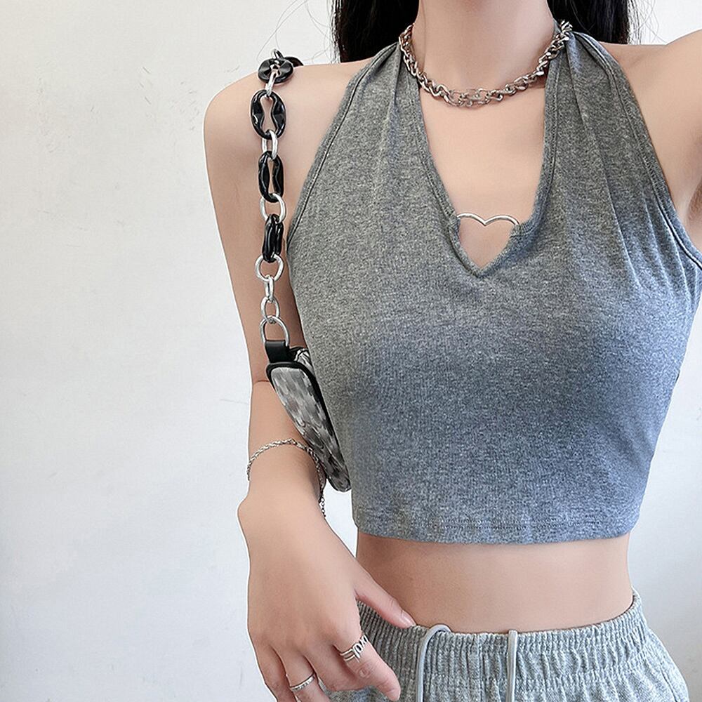レディース キャミソール ショート丈 ハートチャーム 肩だし へそ出し 美胸 春夏 セクシー オルチャン 全4色無地インナー トップス 夏服 韓国ファッション肌見せコーデには欠かせないマストアイテムです。ホルターネックとハートチャームのデザインがおしゃれなタンクトップで、1枚での着用はもちろん、インナータンクトップとしても活躍します。これからの暑い時期にさらっと一枚で着るも良し、インナーに使っても良しな万能アイテムです。素材:ポリエステル62%+綿33%+ポリウレタン5%カラー:ホワイト/ブラック/ライトグレー/ダークグレーサイズ:ワンサイズ(M)着丈:約18cm 身幅:約33cm 胸囲:約66~90cm裏地:なし伸縮性:あり透け感:ホワイトのみ若干あり生産国:中国※すべて平置きサイズです(採寸方法違いより、多少の誤差がございますので、ご了承ください)。※海外輸入品のため、商品の細部仕様は多少異なる場合がございます。予めご了承の上、ご注文お願い致します。