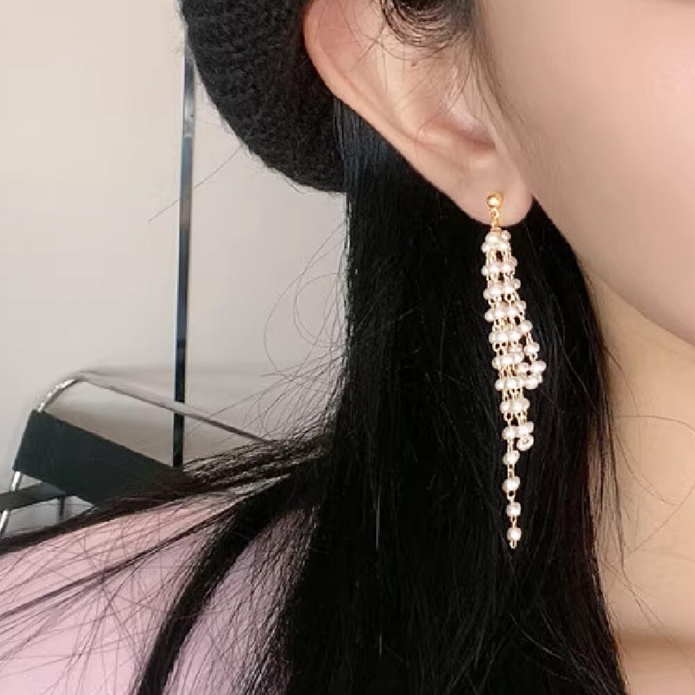 タッセルイヤリング 大人可愛い フリンジピアス 上品清楚 ぶら下がり耳飾り アクセサリー プチプラ プレゼント彼女ギフト小粒パール ピアス きれいめイヤリング おしゃれエレガント小さめパールをいびつに繋いだフリンジルックスが立体感を演出するタッセルピアス&イヤリング耳元で揺れて動きのあるデザイン、付けるだけでお顔周りを引き締めてくれて小顔見せも期待できるボリューミーなシルエットが存在感抜群、デイリーコーデはもちろん、セレモニーなどちょっとしたイベントシーンにもマッチする素材:フェイクパール+合金カラー:ホワイトタイプ:ピアス/イヤリング長さ:約7.5cm生産国:中国※ポスト部分は柔らかなシルバー925を使用している為、配送中に少し曲がったり歪んだりすることが稀にあります。お客様ご自身で簡単に復元することはできます。予めご了承の上、ご注文お願い致します。※包装に関しての注意点:こちらの商品は激 安で販売しているため、化粧箱は付いていませんが、商品に傷付かないよう簡易包装で発送とさせていただきます。※海外輸入品のため、商品の細部仕様は多少異なる場合がございます。予めご了承の上、ご注文お願い致します。