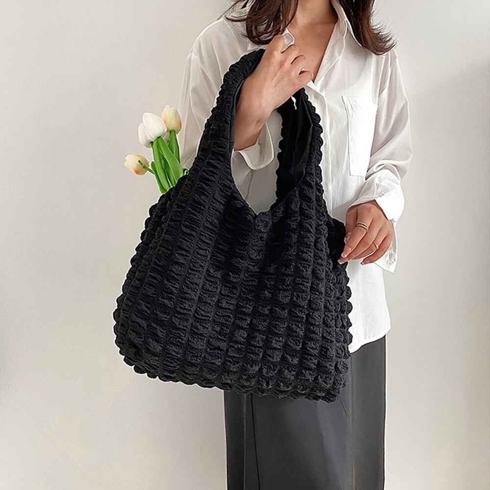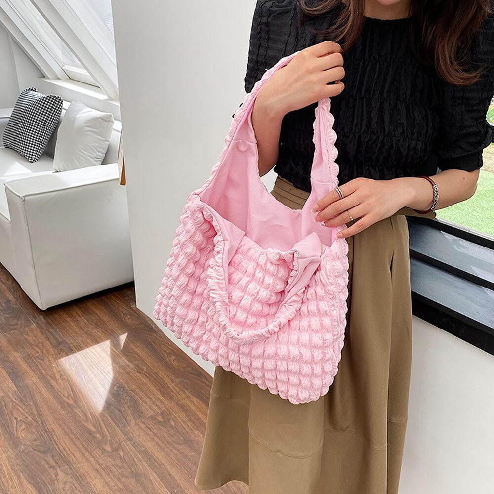 大人可愛いポコポコバッグ カジュアルバッグ きれいめワンショルダーバッグ レディース ソフトバッグ 軽量大容量 洗える鞄通勤通学バッグ旅行 マザーズバッグ軽い オルチャンバッグ夏ポコポコっとした生地感が華やかな印象、持つだけでこなれ感のある韓国Designポップコーントートバッグ抜群の収納力を誇る大容量肩掛けバッグ、荷物の出し入れもお手入れも簡単楽ちん、形崩れしにくく丈夫で長持ち軽量タイプなのでタウンユースからレジャーシーンまで、実用性はもちろん、ファッションアイテムとしてもスタイリングのポイントになる主役級Bag素材:ポリエステルカラー:ブラック/アイボリー/ピンク/イエロー/ホットピンクサイズ:高さ:約25cm 底横幅:約34cm マチ:約9.5cm 持ち手高さ:約20cm(調節不可、取り外し不可)重さ:約160g裏地:あり内ポケット:なし生産国:中国※すべて平置きサイズです(採寸方法違いより、多少の誤差がございますので、ご了承ください)。※海外輸入品のため、商品の細部仕様は多少異なる場合がございます。予めご了承の上、ご注文お願い致します。