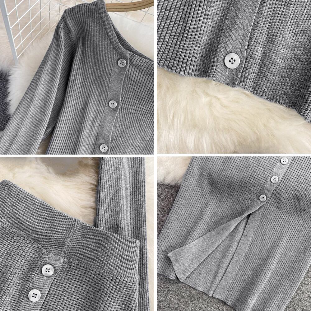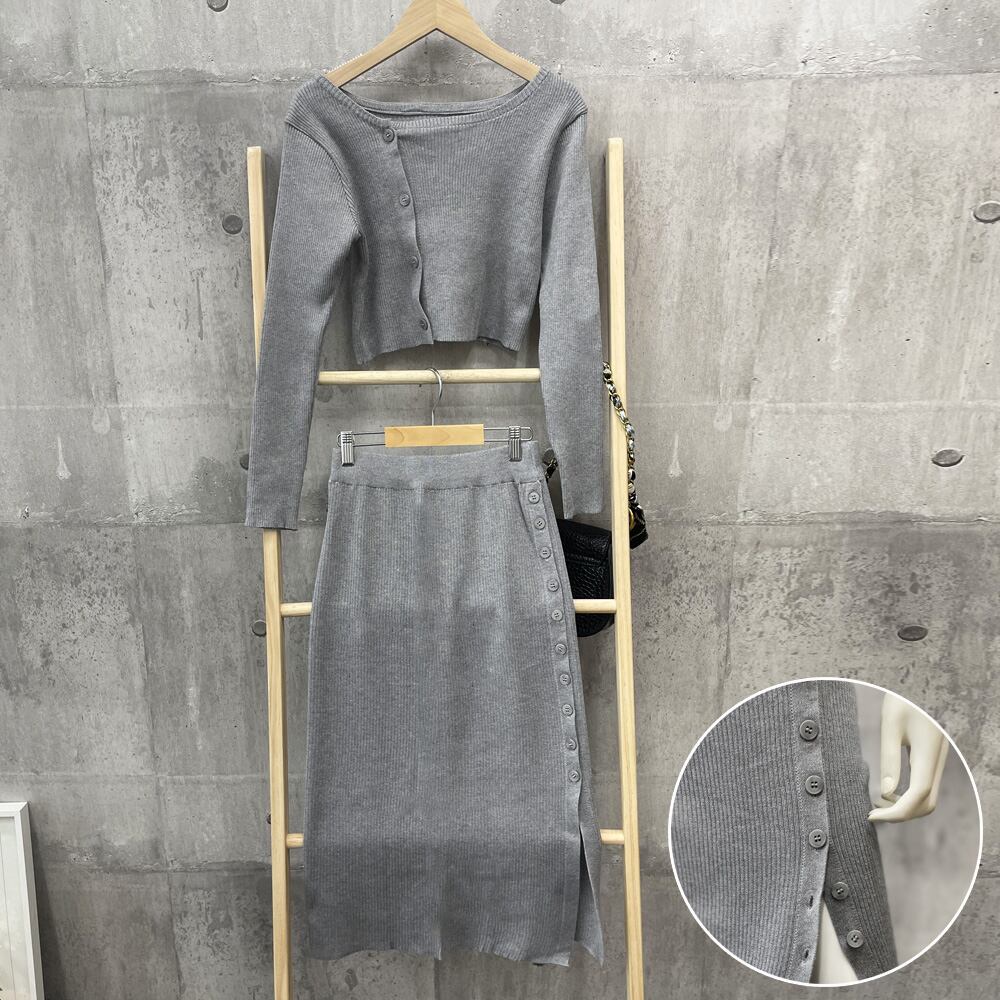 ショート丈 ニットトップス ボタン開きスリット タイトスカート セクシー 2点セット ハイウエスト サイドボタンスカートへそ出し トップス 韓国風ニットセット 着やせスカート無地ショート丈トップス+ボタン開きスリット入りタイトスカートの2点ニットセットが登場トップスのへそ出し仕様はスタイルを良く魅せてくれるスカートはボタン開きスリット入りで縦のラインを強調し、細長美脚を演出してくれるセットでの着用はもちろん、それぞれお手持ちのアイテムを合わせれば、コーデの幅が広がる素材:ポリエステル65%+綿35%カラー:ブラック/グレーサイズ:ワンサイズトップス:着丈:約36cm 肩幅:約32cm 袖丈:約52cm ゆき:約68cm 身幅:約36cm 胸囲:約72-135cmスカート:スカート丈:約72cm ウエスト(ゴム仕様):約60-120cm ヒップ:約74-150cm裏地:なし伸縮性:あり透け感:なし生産国:中国※すべて平置きサイズです(採寸方法違いより、多少の誤差がございますので、ご了承ください)。※海外輸入品のため、商品の細部仕様は多少異なる場合がございます。予めご了承の上、ご注文お願い致します。