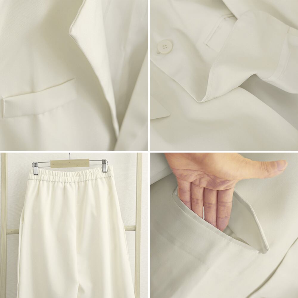 スーツワイドパンツ 上下セット セミワイドパンツ ゆったりシルエット 服 おしゃれボトムス オフィス 30代40代50代セットアップ 上品 ロングパンツ 美脚 長袖2点セット通勤シンプルで着回し抜群なセットアップが3色展開で登場タック入りのワイドパンツでカジュアルさもありつつ、キチンと感もアップまた上下どちらにもポケットが付いているのも嬉しいポイントセットで着用するのはもちろん、単品でも着回し力が高く、シーズンムードを盛り上げるアイテムトップス素材:ポリエステル100%ボトムス素材:ポリエステル100%裏地素材:ポリエステル100%カラー:ブラック/オフホワイト/ダークベージュサイズ:S/M/L/XLトップス:[S]着丈:約70cm 肩幅:約40cm 袖丈:約56cm 胸囲:約96cm[M]着丈:約72cm 肩幅:約41cm 袖丈:約58cm 胸囲:約100cm[L]着丈:約74cm 肩幅:約42cm 袖丈:約58cm 胸囲:約104cm[XL]着丈:約76cm 肩幅:約44cm 袖丈:約58cm 胸囲:約108cmボトムス(ウエストは後ろゴム仕様):[S]着丈:約97cm ウエスト:約58-66cm ヒップ:約104cm[M]着丈:約98cm ウエスト:約62-70cm ヒップ:約106cm[L]着丈:約99cm ウエスト:約66-74cm ヒップ:約108cm[XL]着丈:約101cm ウエスト:約72-80cm ヒップ:約120cm裏地:あり伸縮性:なし透け感:なし生産国:中国※すべて平置きサイズです(採寸方法違いより、多少の誤差がございますので、ご了承ください)。※海外輸入品のため、商品の細部仕様は多少異なる場合がございます。予めご了承の上、ご注文お願い致します。
