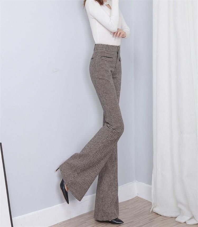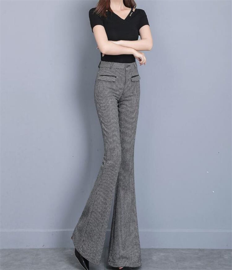 トレンド感をマーク カジュアル ロングパンツ ハイウエスト ウール チェック マイクロフレアパンツ