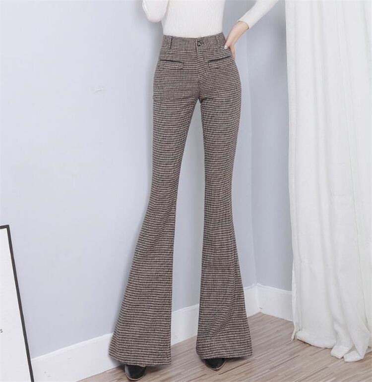 トレンド感をマーク  カジュアル ロングパンツ ハイウエスト ウール チェック マイクロフレアパンツ