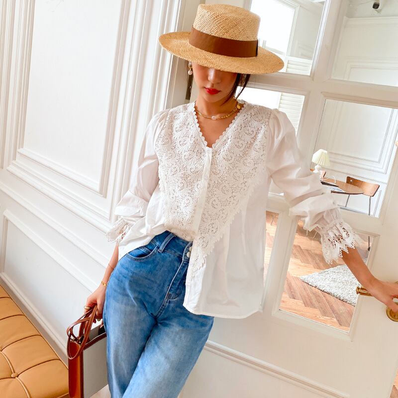 u19835 トップス レディース シャツ 上着 夏秋新作 日系スタイル Vカラー レース 長袖