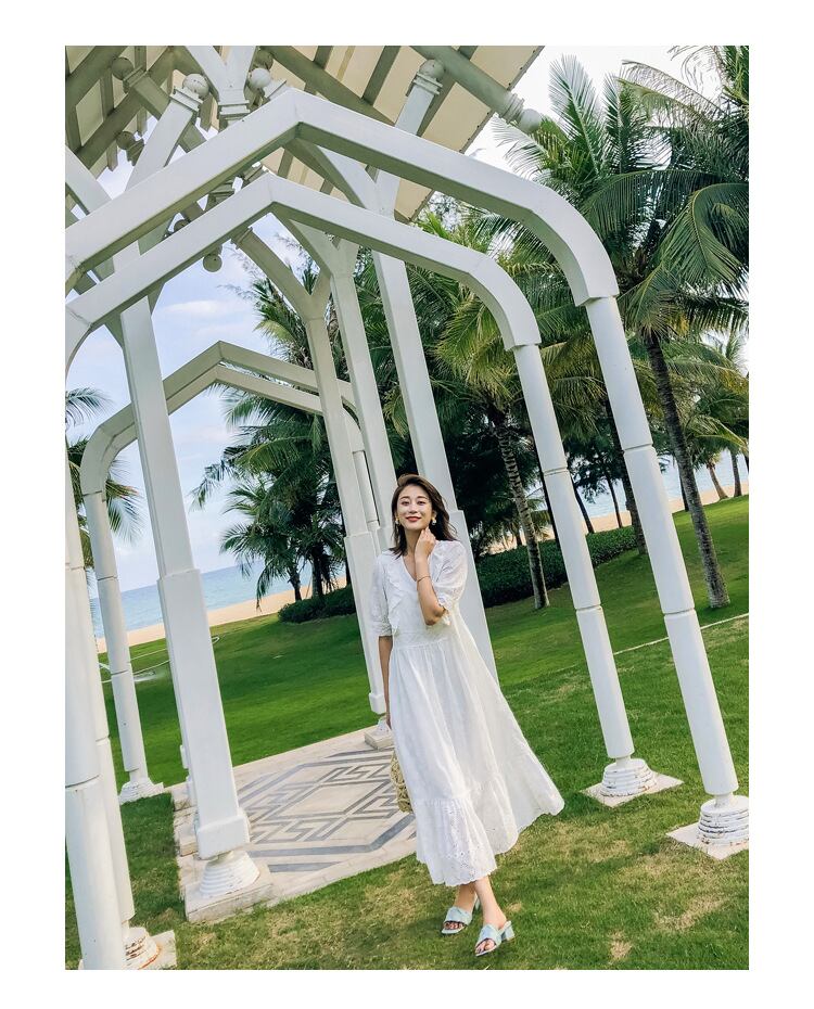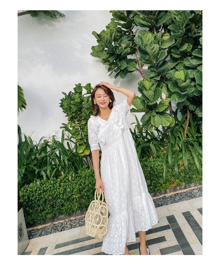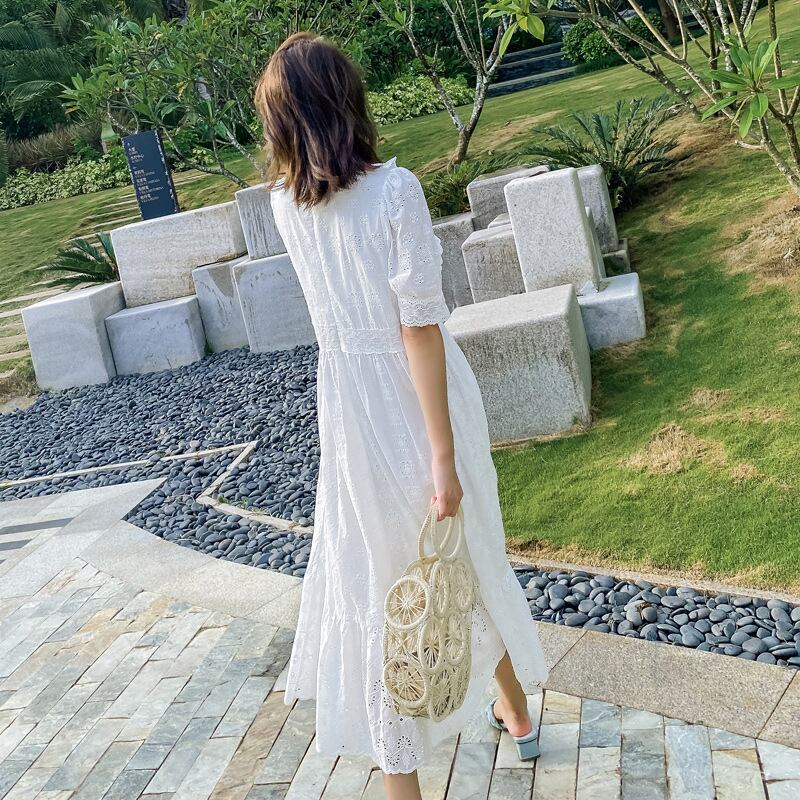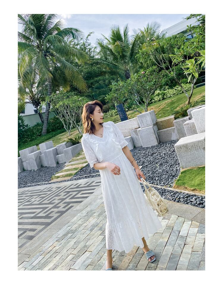 u19525 Vネックワンピース レディース 夏新作 ロング丈 パフスリーブ 刺繍 エレガンス