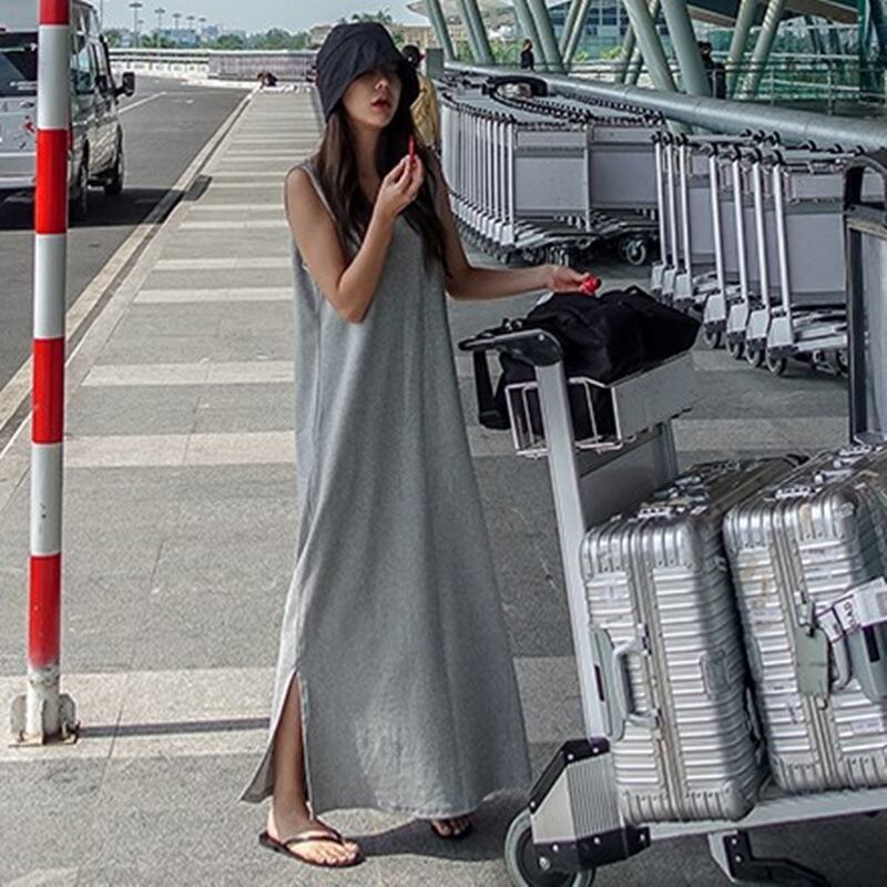 u19414 ワンピース 夏新作 レディース ノースリーブ カジュアル マキシ 無地 トレンドカジュアル