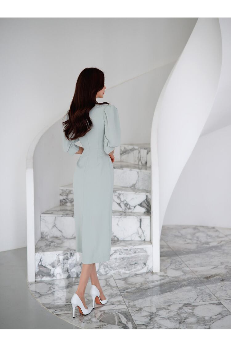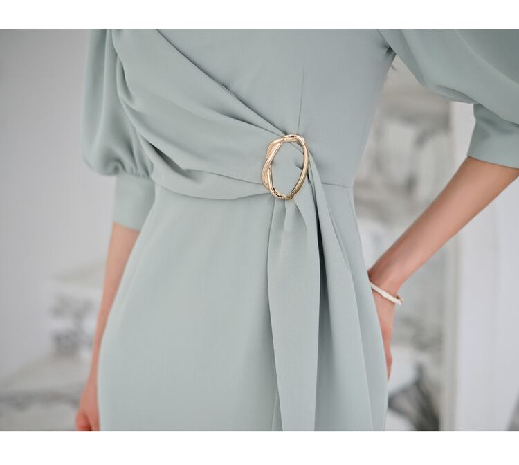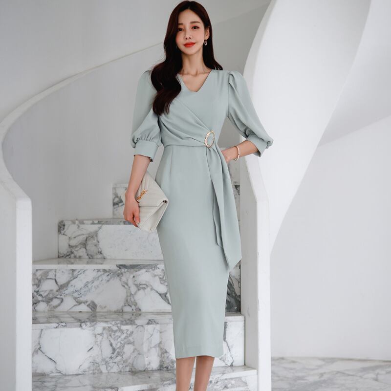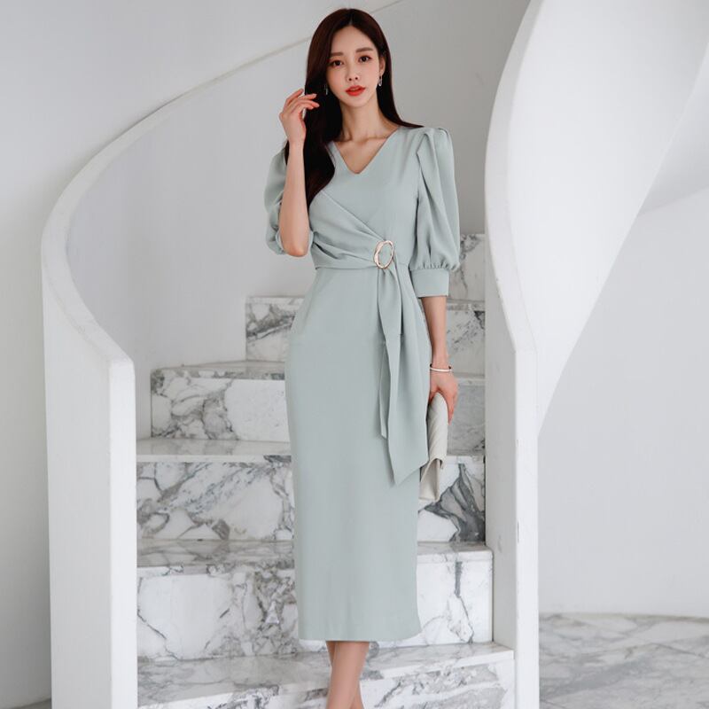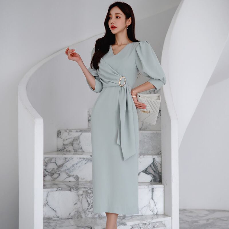 u19308 ワンピース 着痩せ レディース 夏新作 ロング丈 エレガンス Vネック パフスリーブ