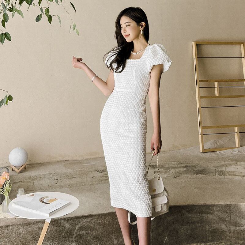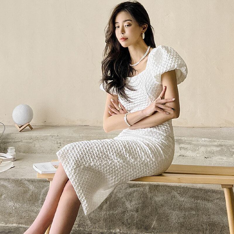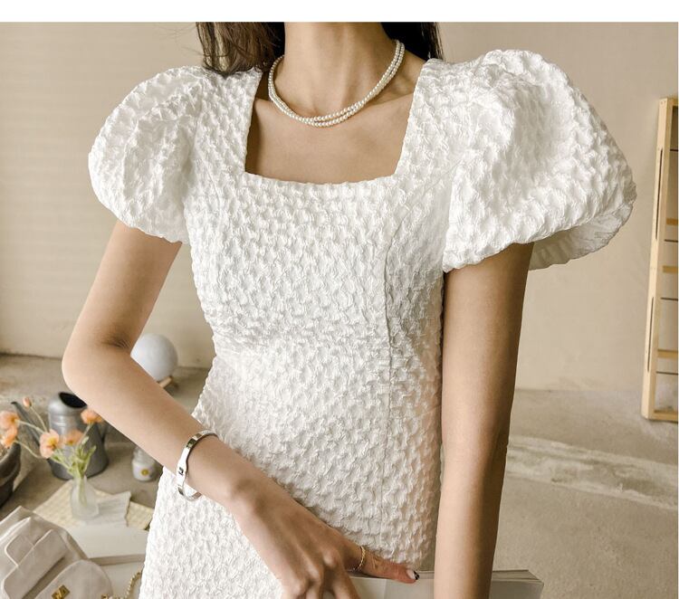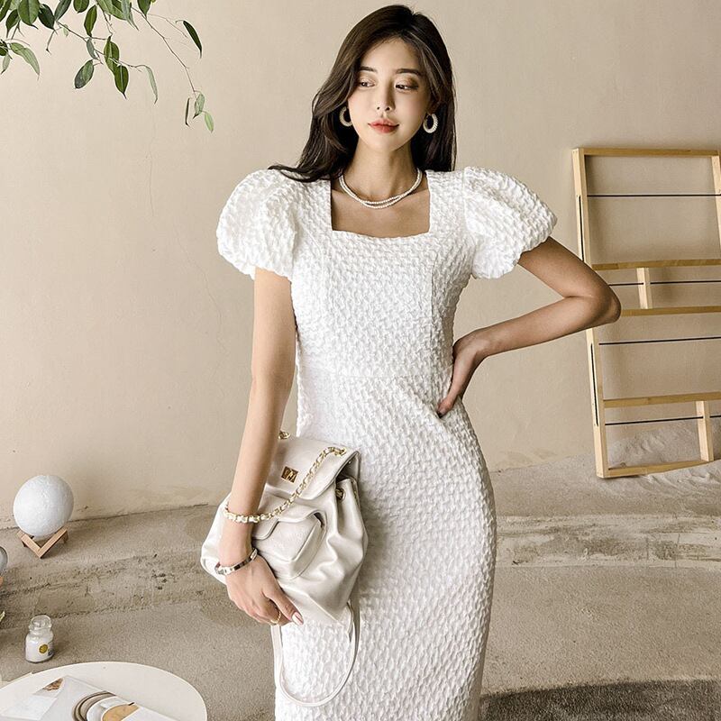 u19305 ロングワンピース レディース  夏新作 着痩せ エレガンス パフスリーブ 通勤 スクエアネック